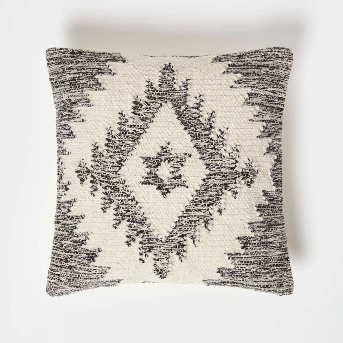Geometric style traditional grey handwoven kilim cushion, a textured cushion featuring a grey and cream diamond design woven from pure wool and 100% cotton.