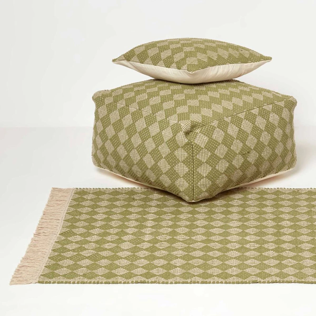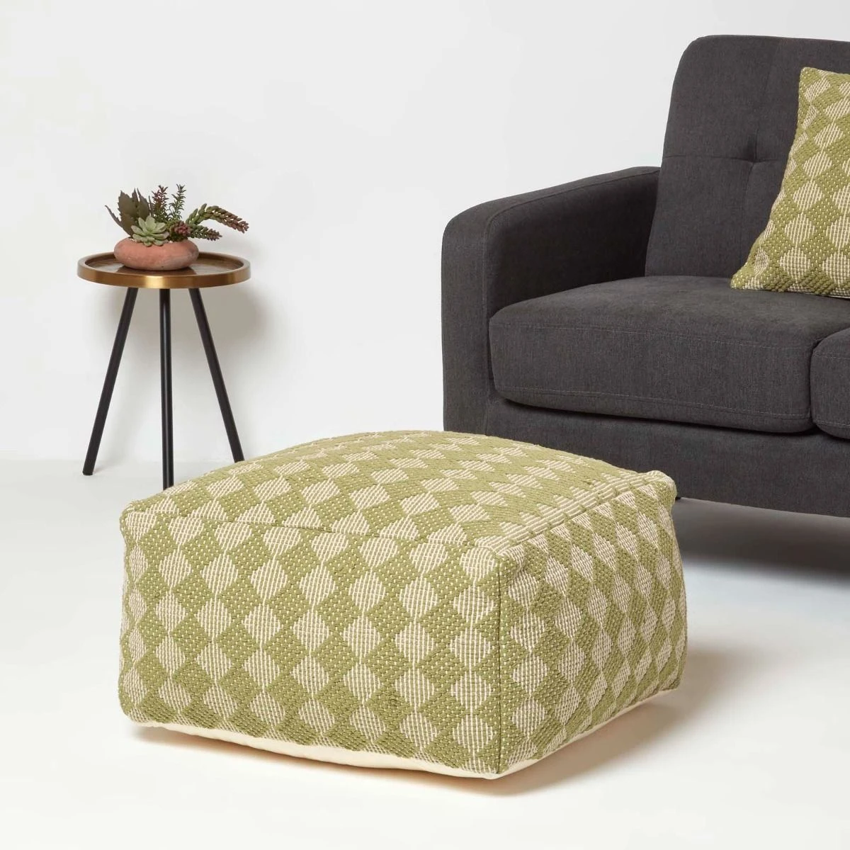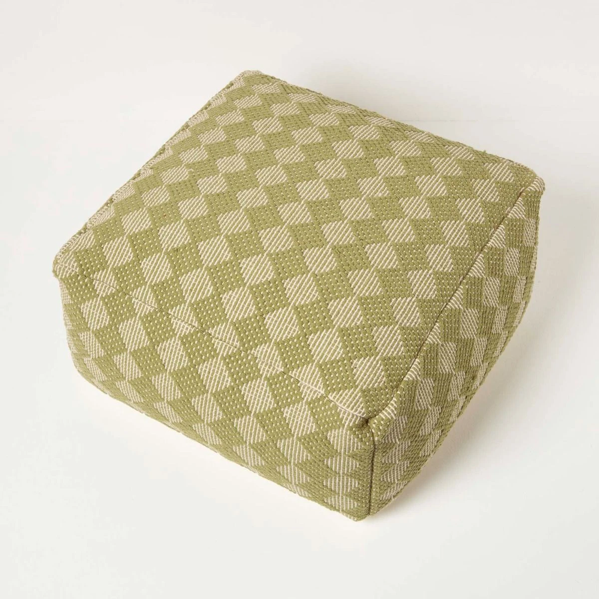 Lima handwoven bean bag pouffe in ochre green. An on-trend green footstool with a luxurious 100% cotton cover over a sturdy polystyrene filling, designed to be a durable and stylish home accessory.