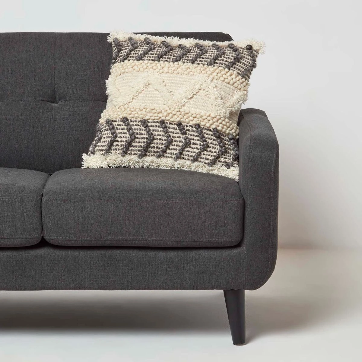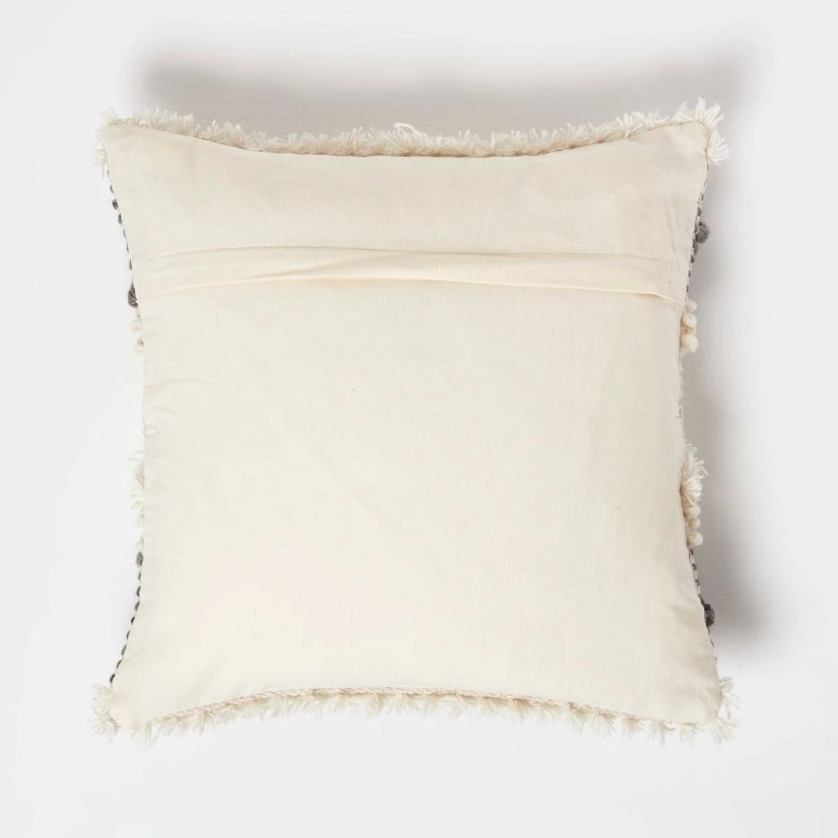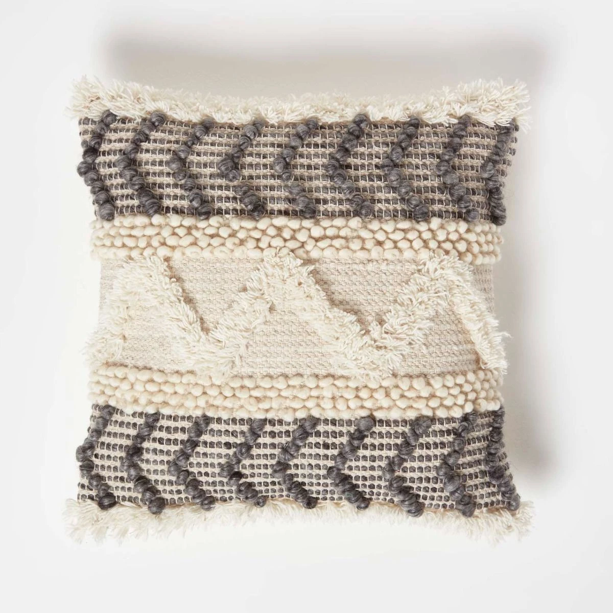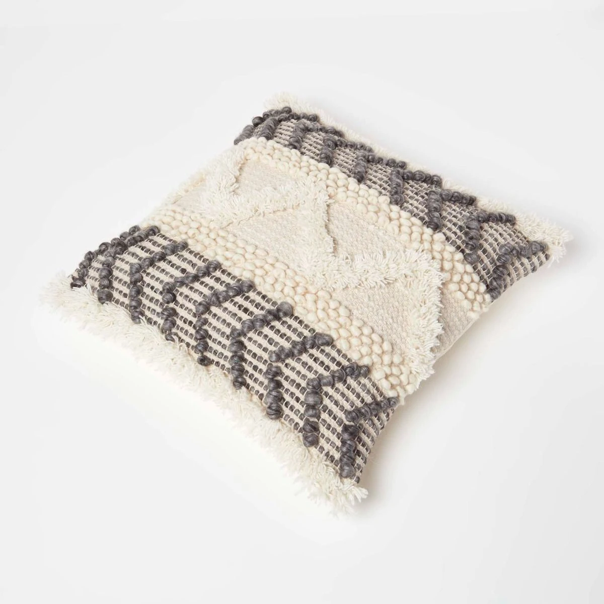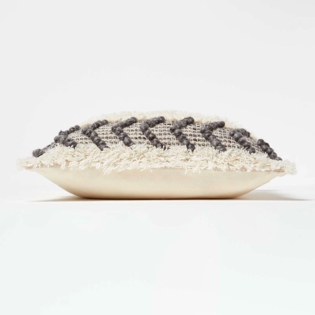 Grey and cream handwoven kilim cushion with chevron tufted design, a textured cream and grey scatter cushion woven from pure wool and 100% cotton.