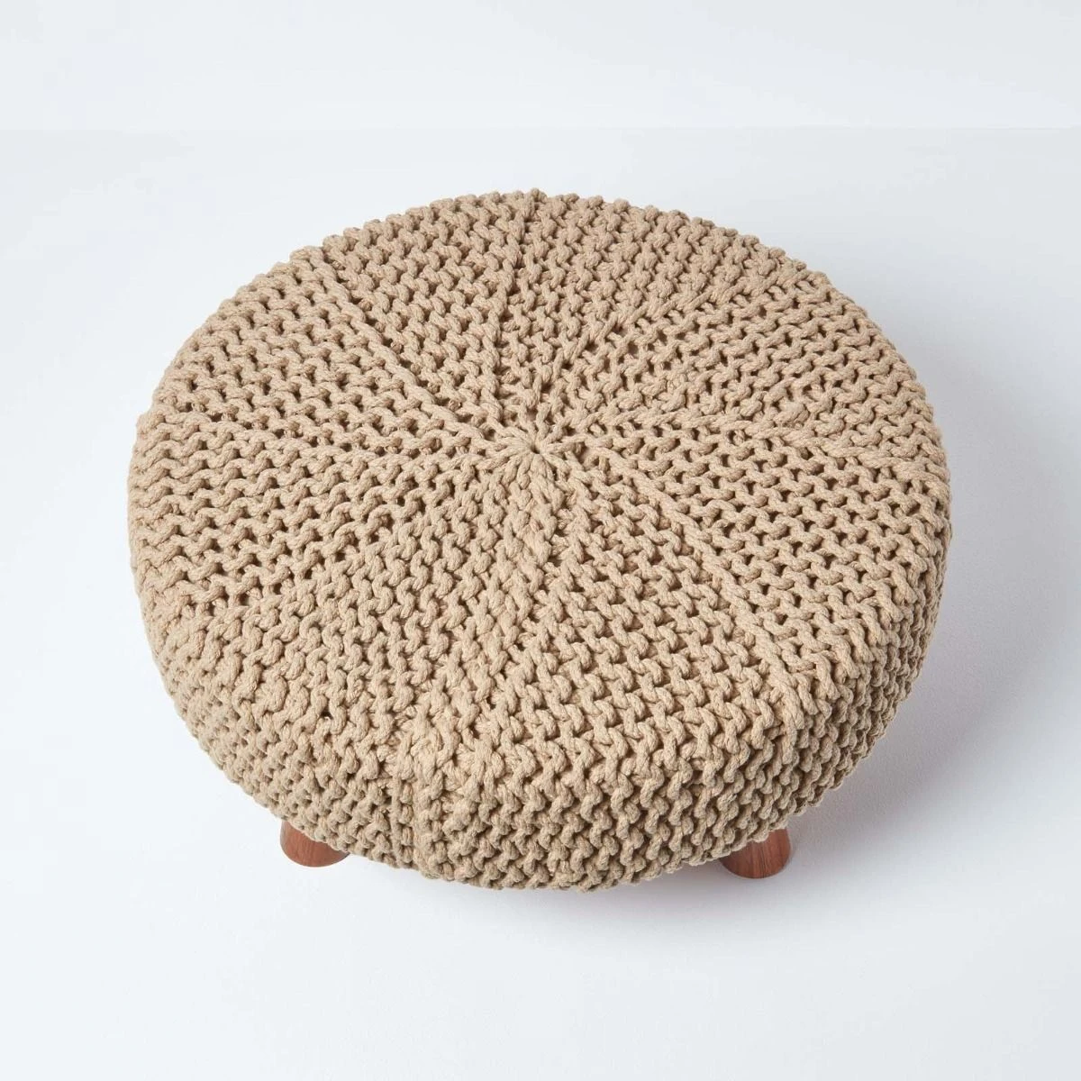 Linen colour large circular footstool with wooden legs, measuring 62cm wide this pouffe is ideal for living areas and is covered in a neutral linen colour chunky knit 100% cotton.