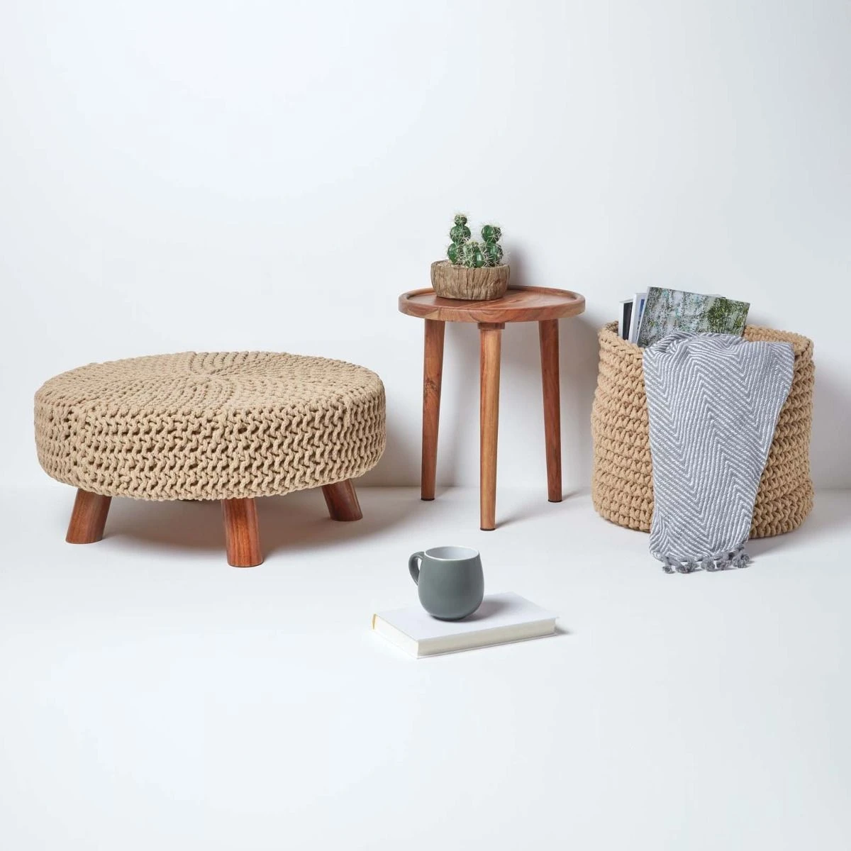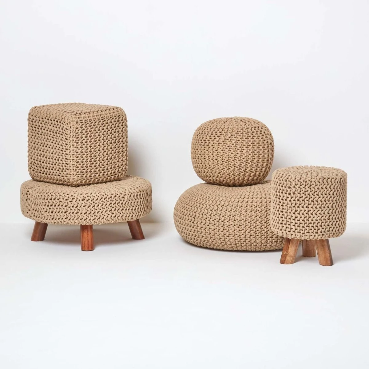 On trend, versatile chunky knitted pouffe designed for living rooms, bedrooms or children’s playrooms. Measuring 62cm wide, this linen colour pouffe is supported by a sturdy wooden frame and sits on top of 4 wooden legs. Covered in a chunky knitted cotton weave in a neutral linen colour, this large contemporary style footstool will compliment most decors styles and room colours.