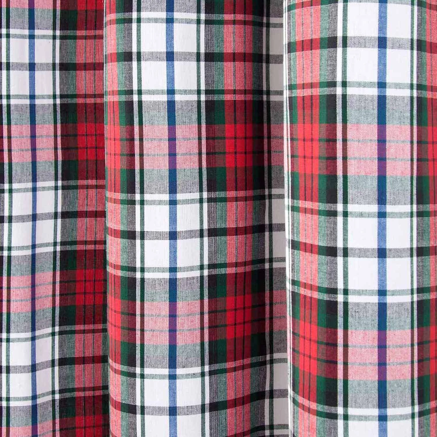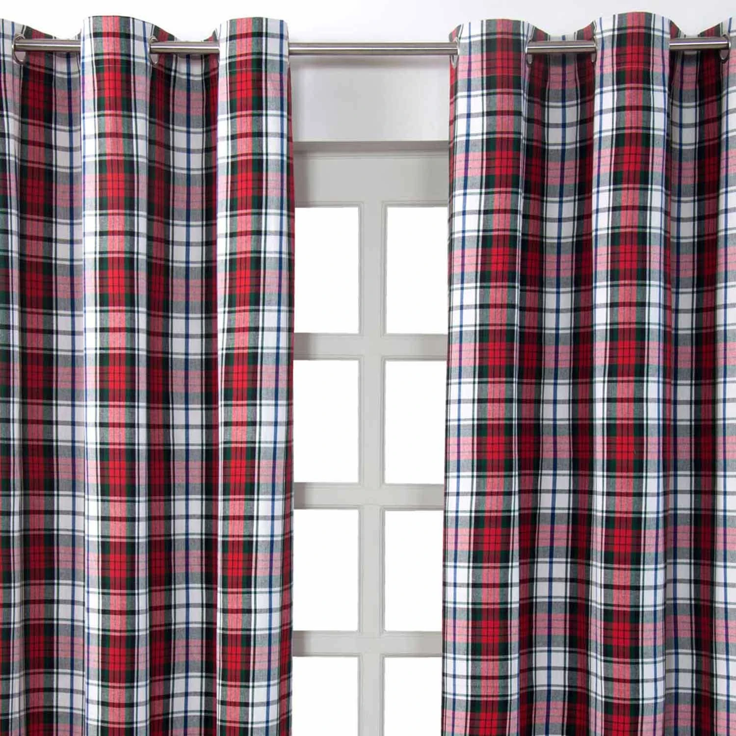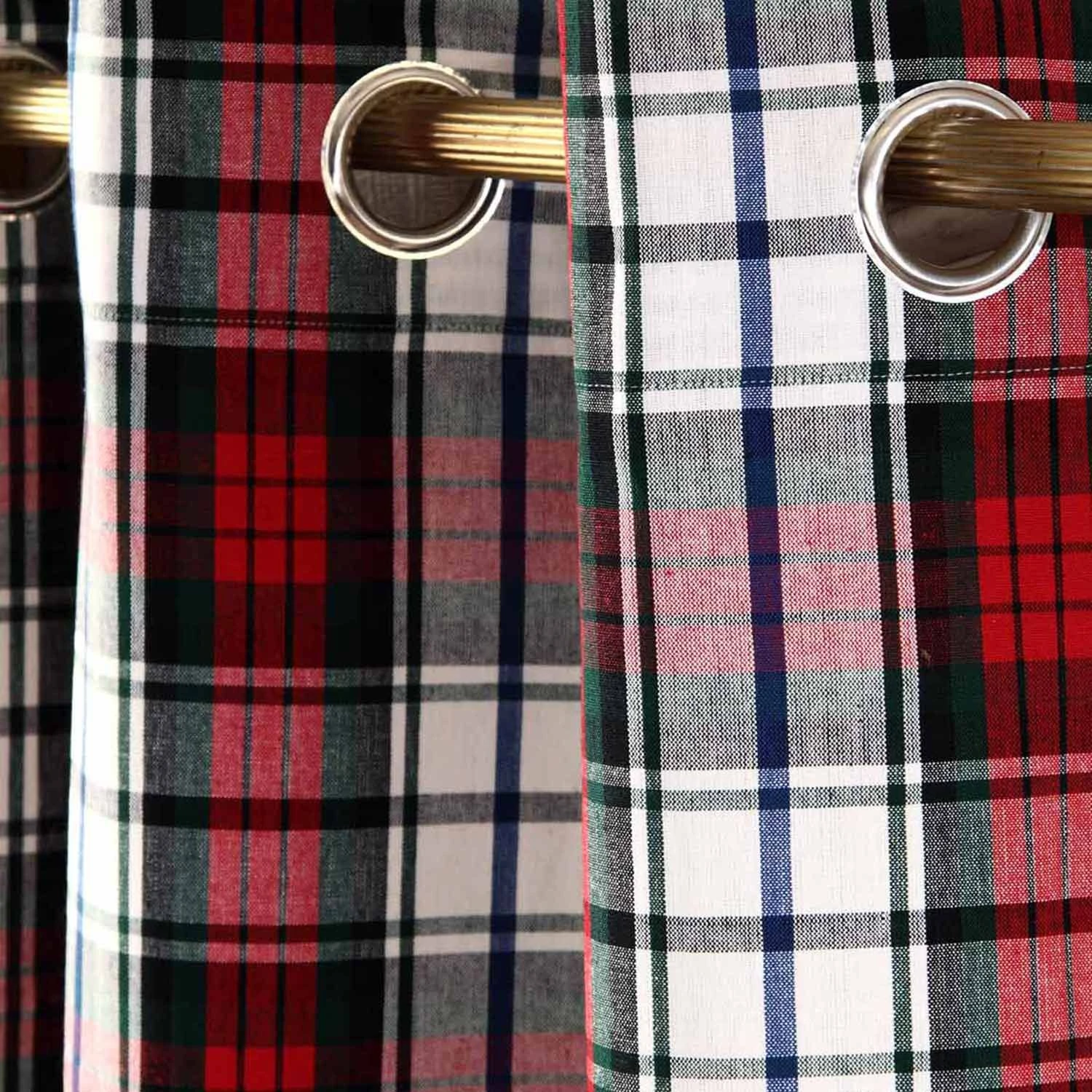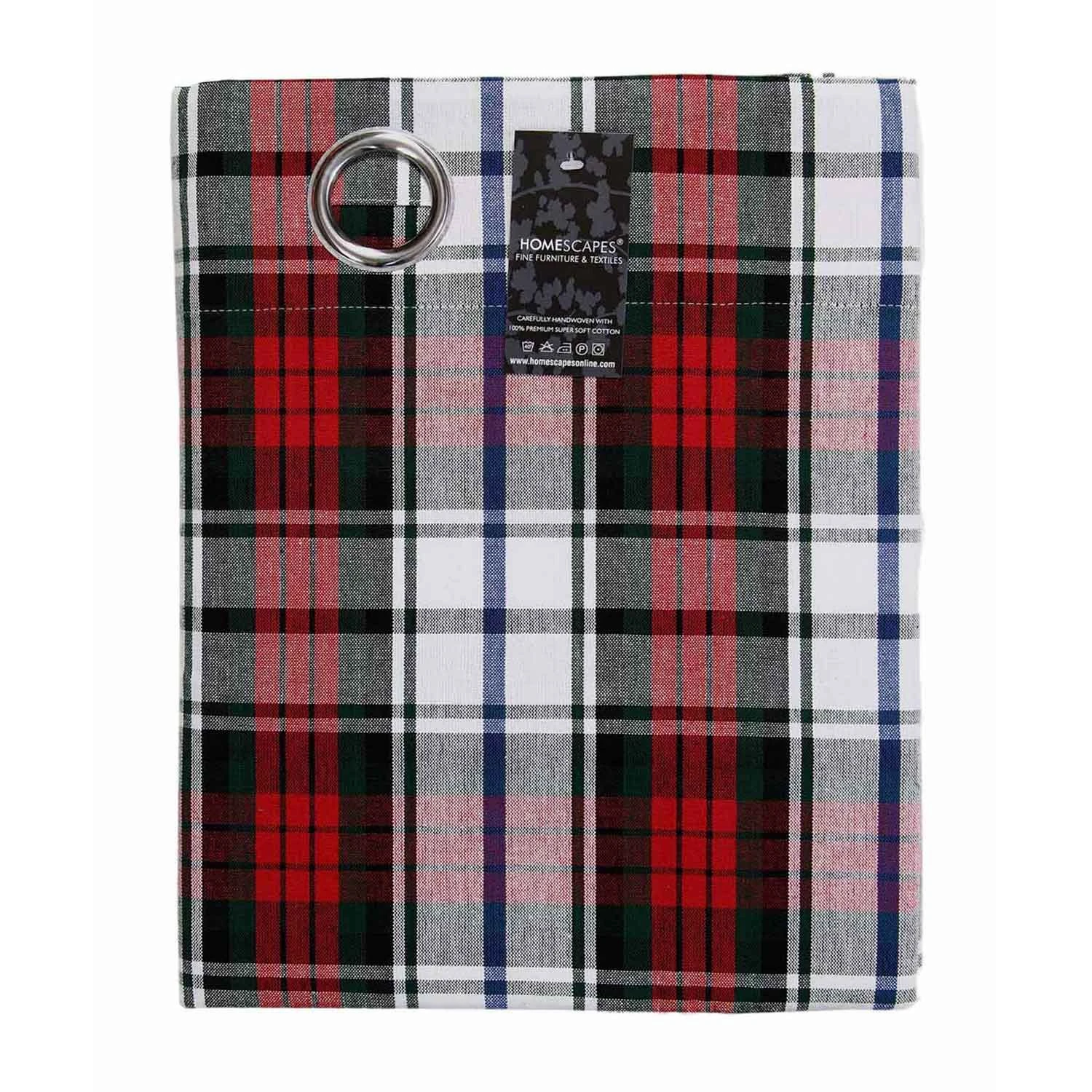 These timeless Macduff Tartan Eyelet Curtains will fit perfectly with the decor of any room due to the classic combination of red, white, black and blue that has been used in their design. These classic Macduff Tartan Curtains are one pair in Homescapes impressive range of pure cotton designer curtains in many charming designs and soft prints. Our modern ring top or eyelet curtains are made with heavy cotton fabric and a wide range of colours, which allows our curtains to coordinate well with almost any interior setting and the vivid colours used are able to uplift the mood of any room. These curtains are suitable for all spaces, and would fit perfectly in rooms with both modern and tradition decors due to their versatile print. Please note, these curtains are not lined and so they will have to be used in conjunction with a black out curtains in order to make them light proof.