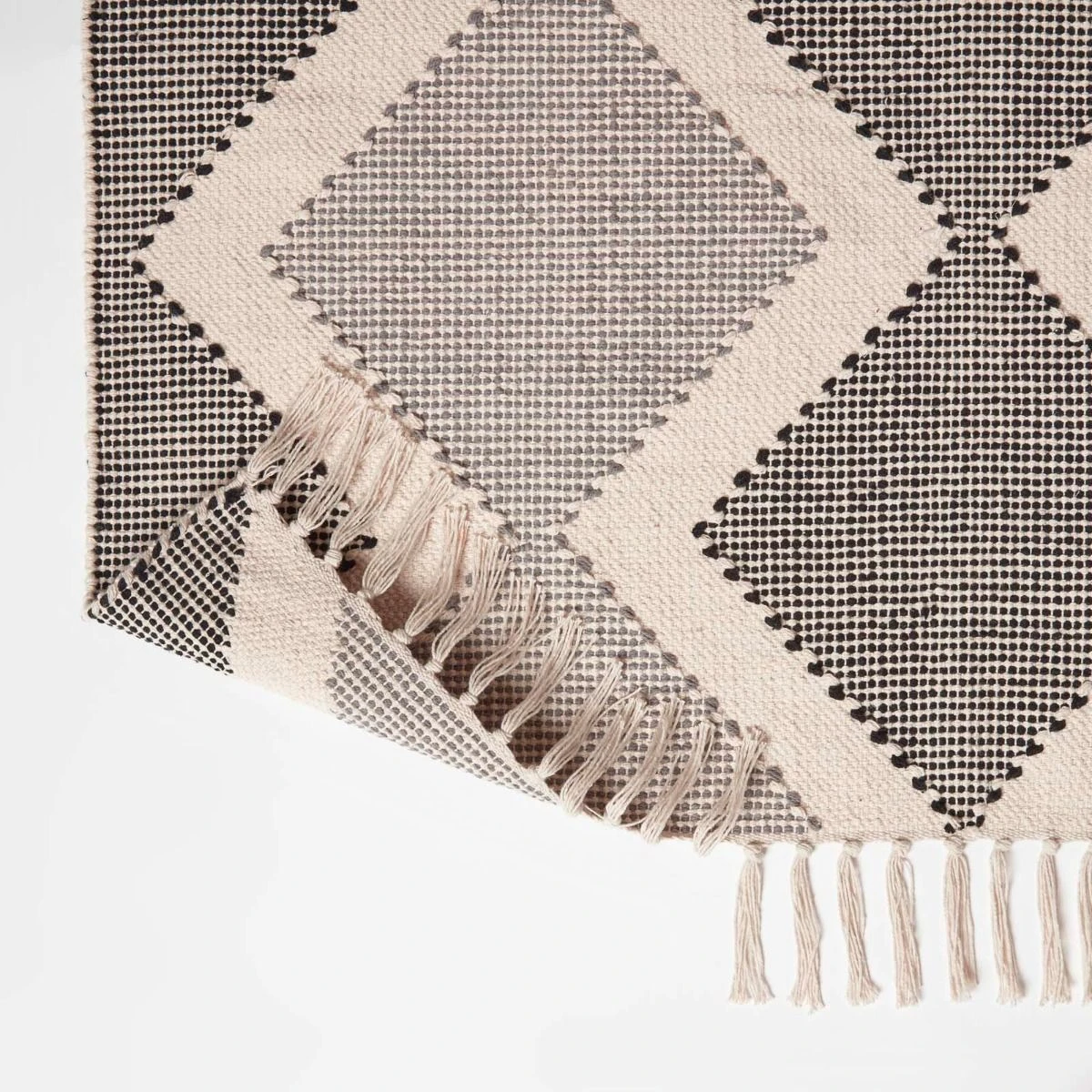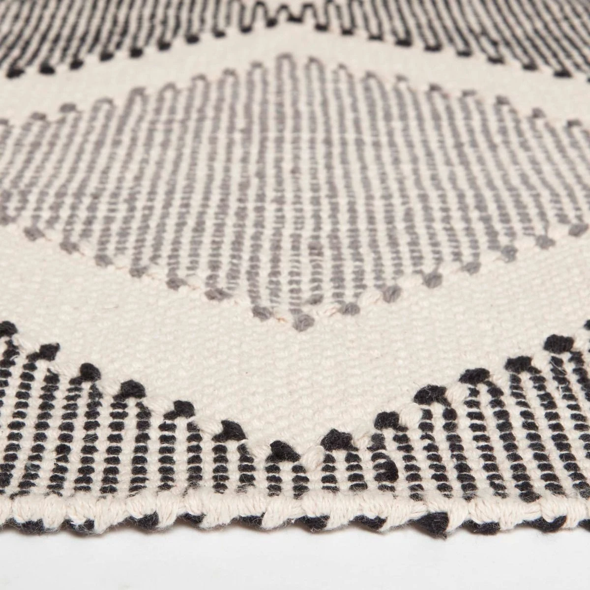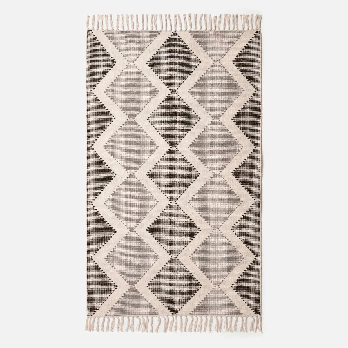 Malmo chevron woven rug in grey and white. Available in two sizes, this textured rug has been handwoven from luxury 100% cotton and features macrame tassels.