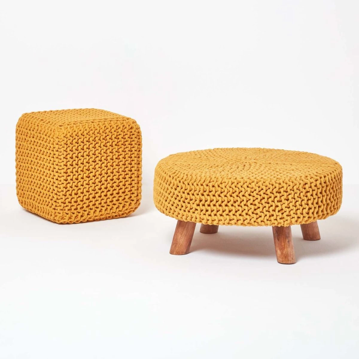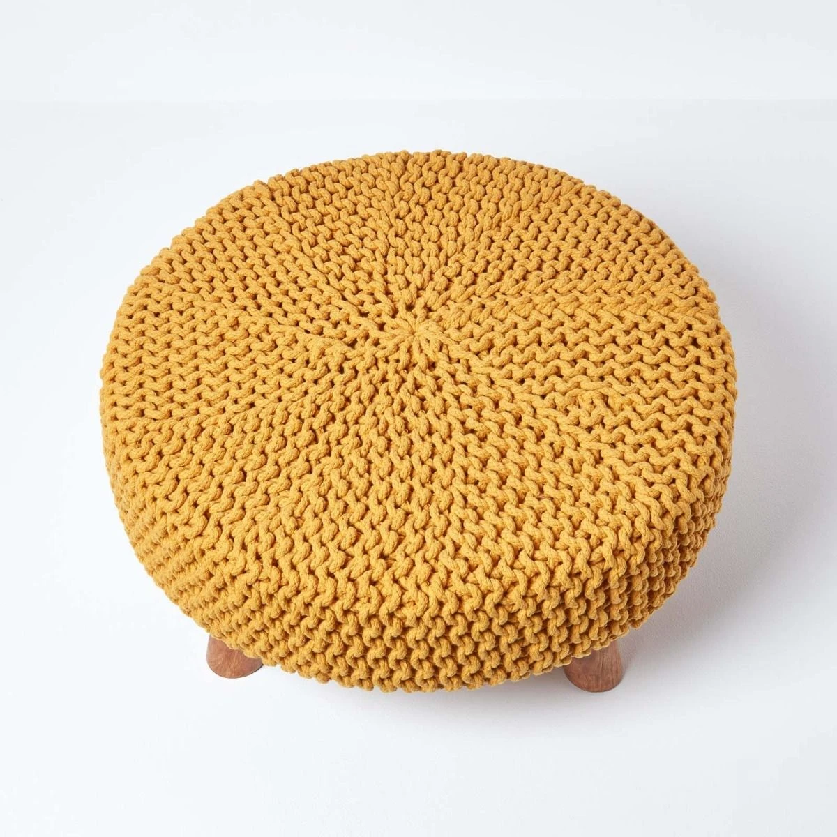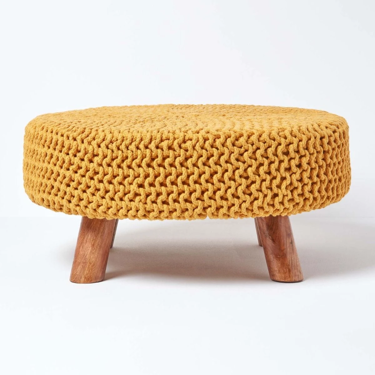 Measuring 62cm round, this mustard 100% cotton knitted footstool includes wooden legs for that extra modern look, an ideal accessory for your living room.