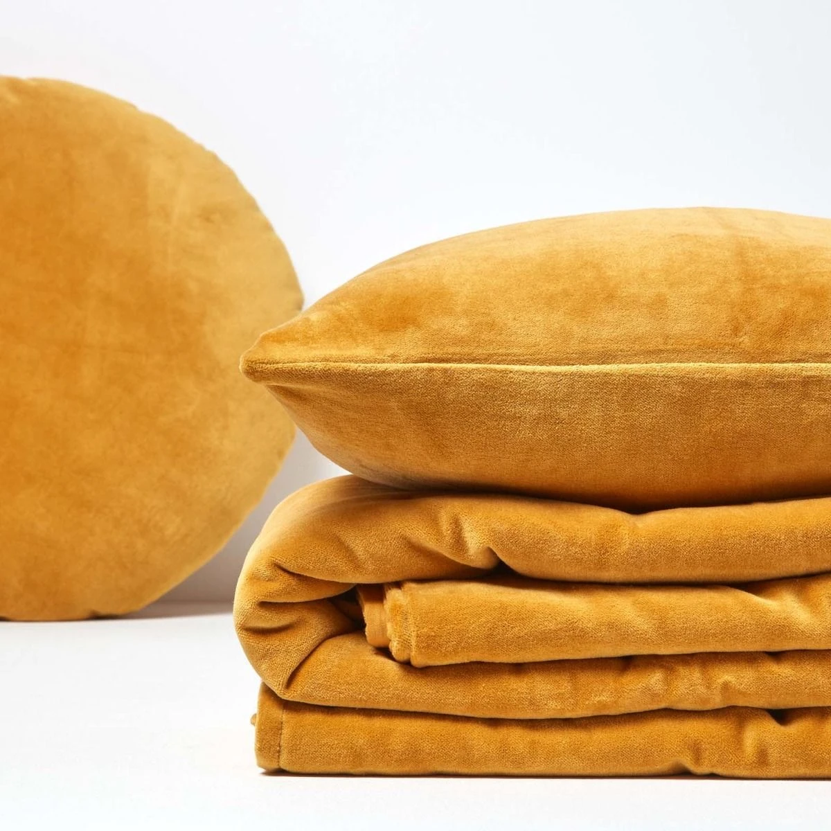 Mustard throw woven from 100% cotton velvet and handstitched with embroidery. For warmth, this quilted throw is filled with polyester fibre, available in 2 sizes.