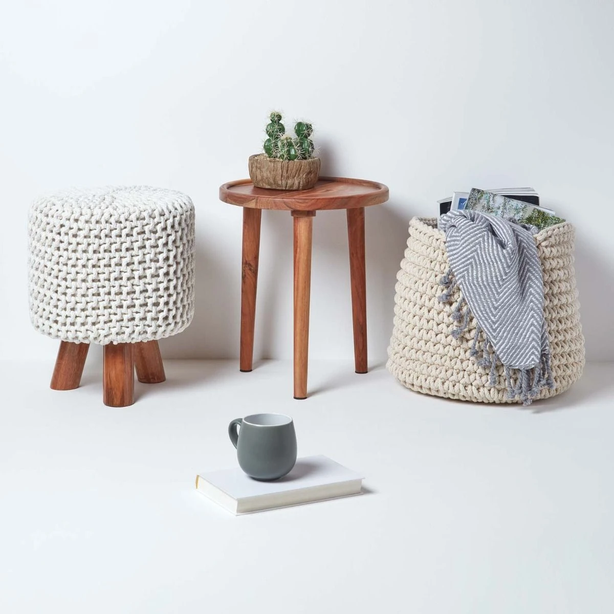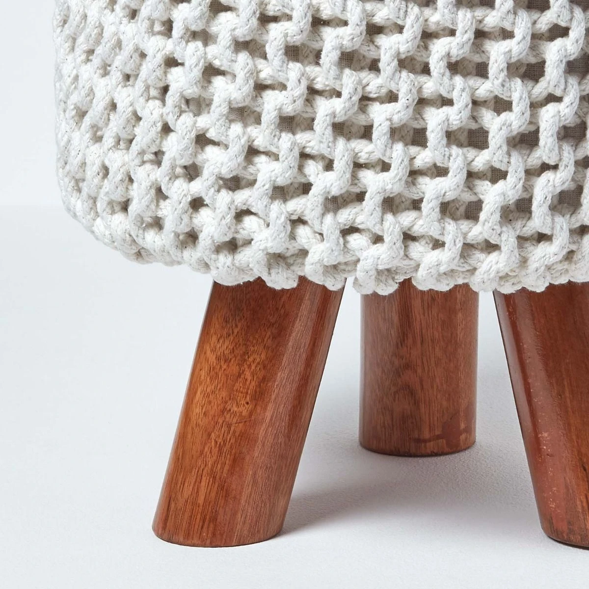 This natural colour, off-white 100% cotton knitted footstool will compliment all room colours and designs, the functional and attractive accessory features three, modern style wooden leg supports and is supported by a rigid wooden frame that is covered with a cushioned seat and chunky knitted cotton, ensuring long lasting stability and rigidity.