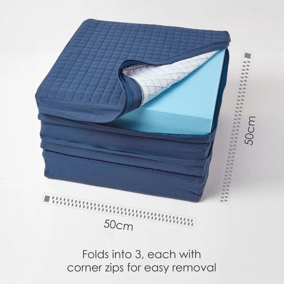Encased within a 100% cotton navy blue cover that can be easily removed, this thick casing features a square pattern quilting which has been lined with thick and durable polyester for added comfort. Easy to use by all ages, the cover features a compartment for each of the 3 square foam cushions, accessible via a zip running down 2 adjacent sides. The cover can be easily removed and washed and the foam re-inserted, keeping your booster cushion clean and fresh. Easy to transport, each booster cushion has a handy carry handle, the cushion can also be folded away when not in use. Part of Homescapes booster cushion collection that includes armchair and 2 seater removable cover booster cushions.