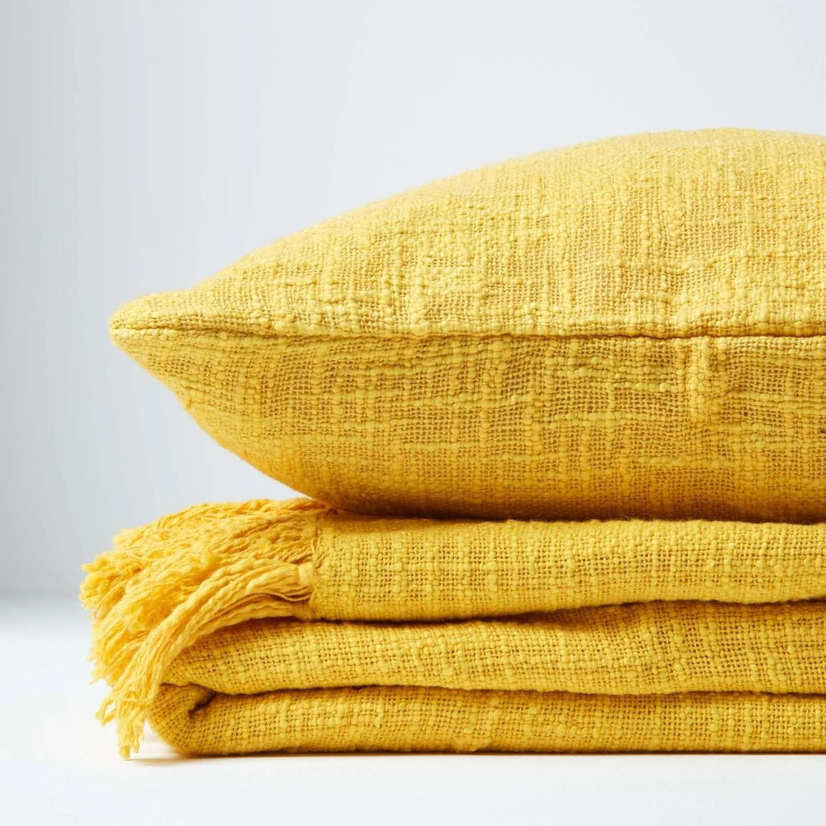 Cheerful and bright, this yellow Nirvana Slub throw from Homescapes has been handwoven from 100% cotton. Three sizes are available, and this throw is machine washable.