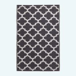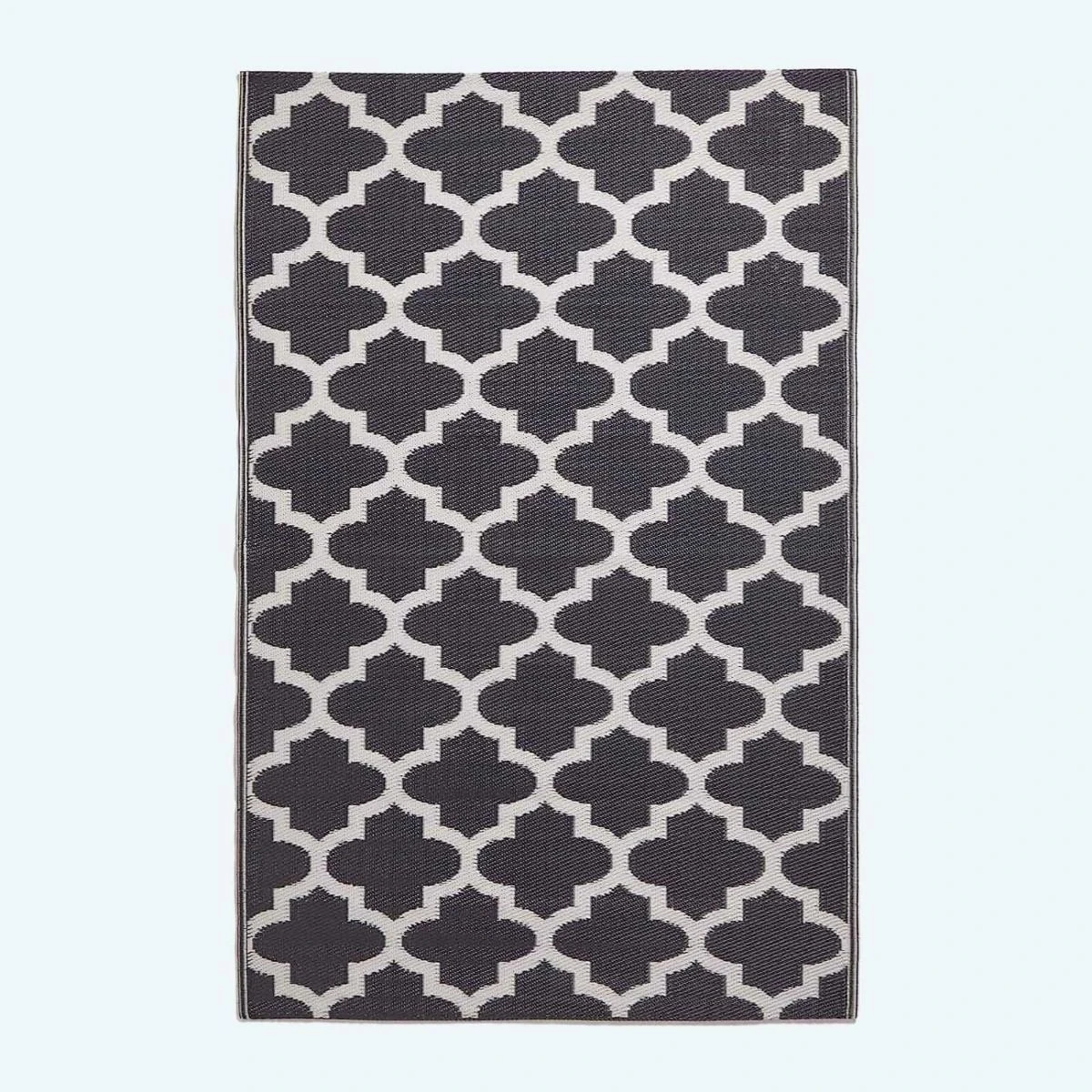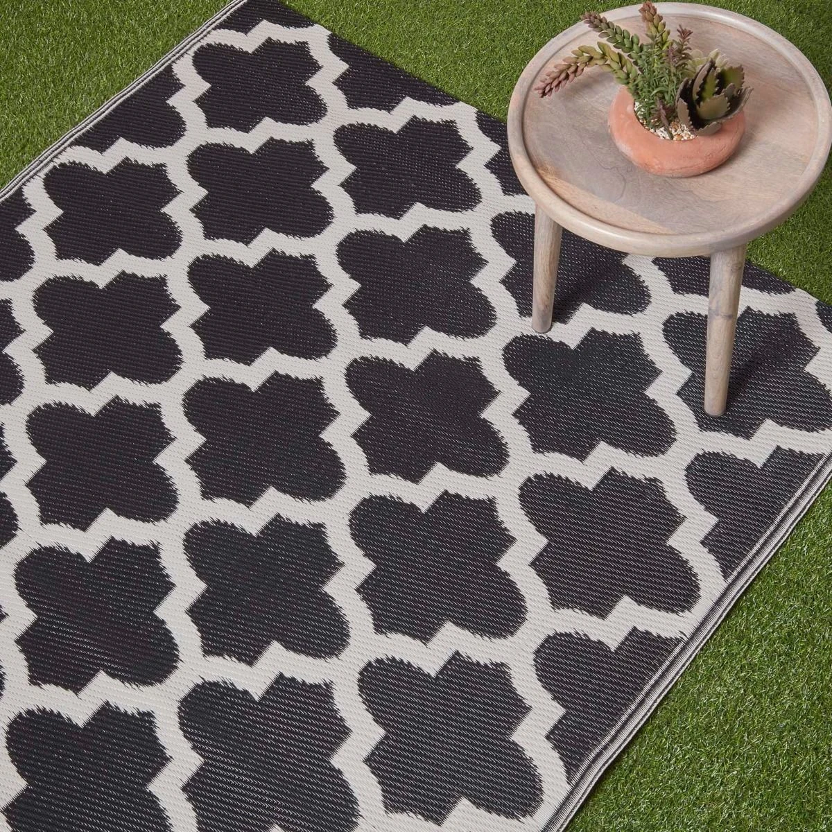 Black and white outdoor rug woven from 100% recycled plastic this contemporary garden rug features a stylish geometric pattern is light weight and weather resistant.