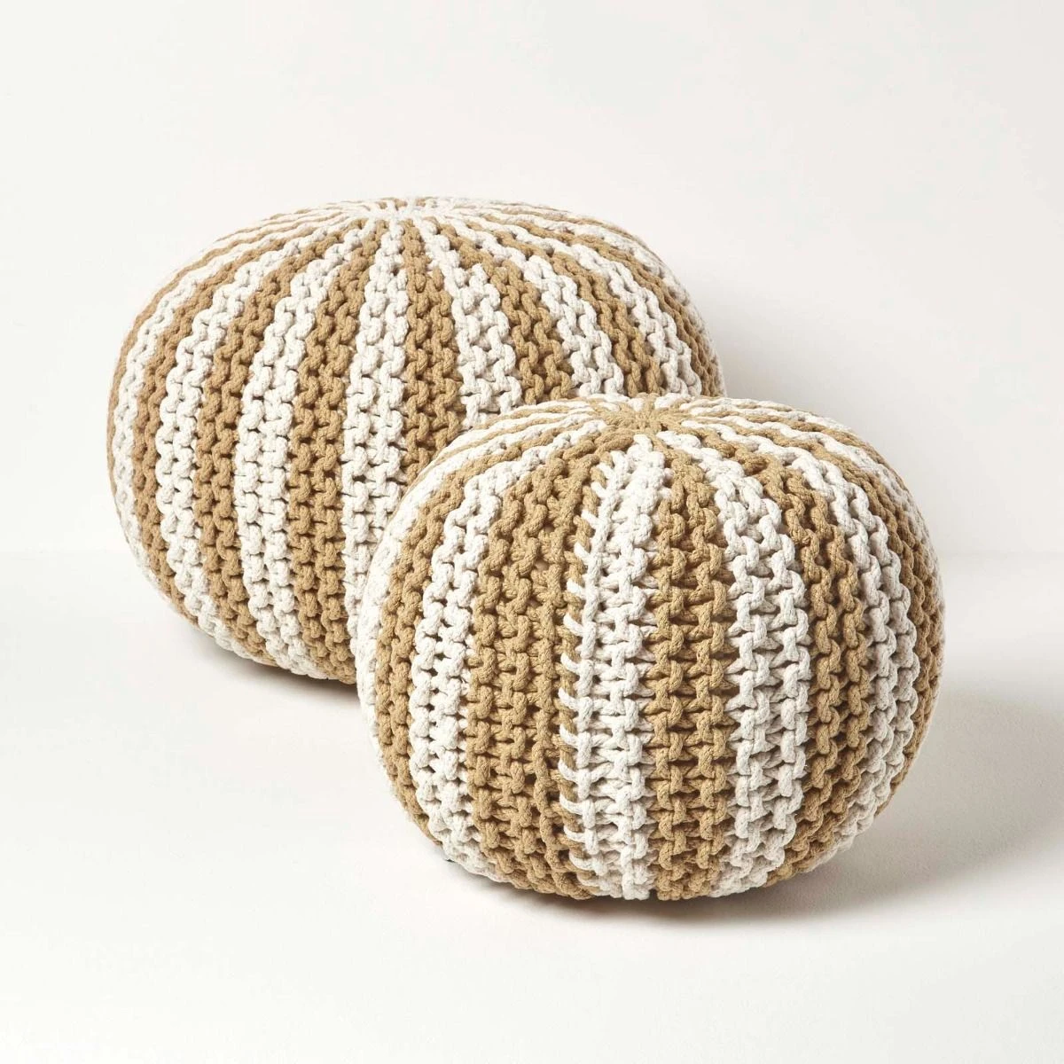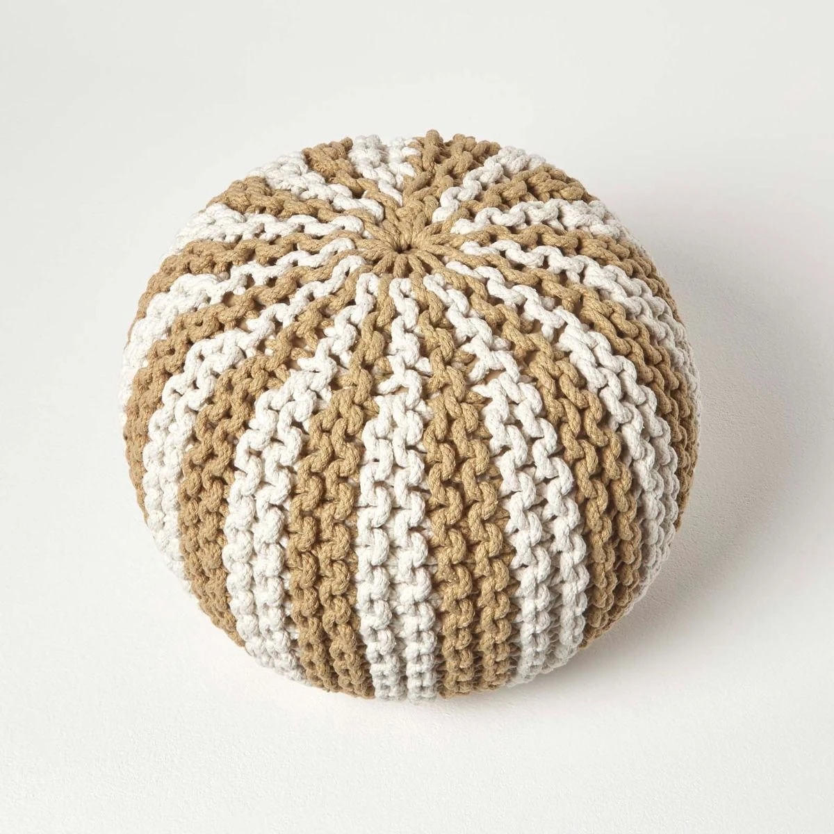 An on-trend striped natural linen and off white knitted pouffe, woven from 100% cotton this chunky knitted footstool is generously filled for lasting shape and comfort..