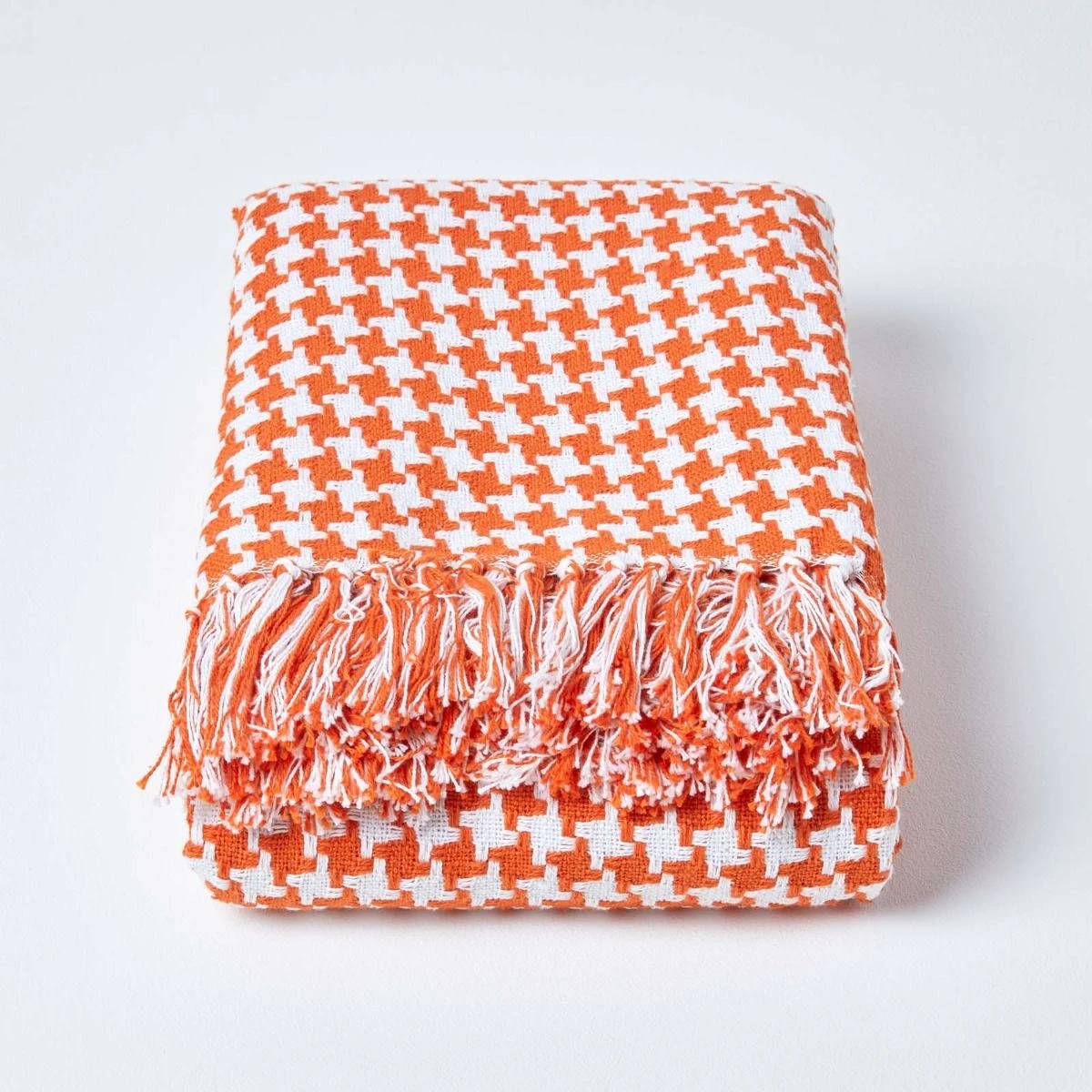 Homescapes Orange Houndstooth 100% Cotton Bedspread Throw makes a lasting effect with its brilliant check pattern. Crafted using a traditional hand loom in India, these covers are of the highest quality and are constructed using 100% soft cotton yarns. This means that the fabric bears a wonderful balance, obtained from the weaving of single yarns.The contemporary classic check designed originated in woven wool cloth in the Scottish lowlands, but has consistently proven itself as a stylish print over the years; just like stripes, it will never go out of fashion.