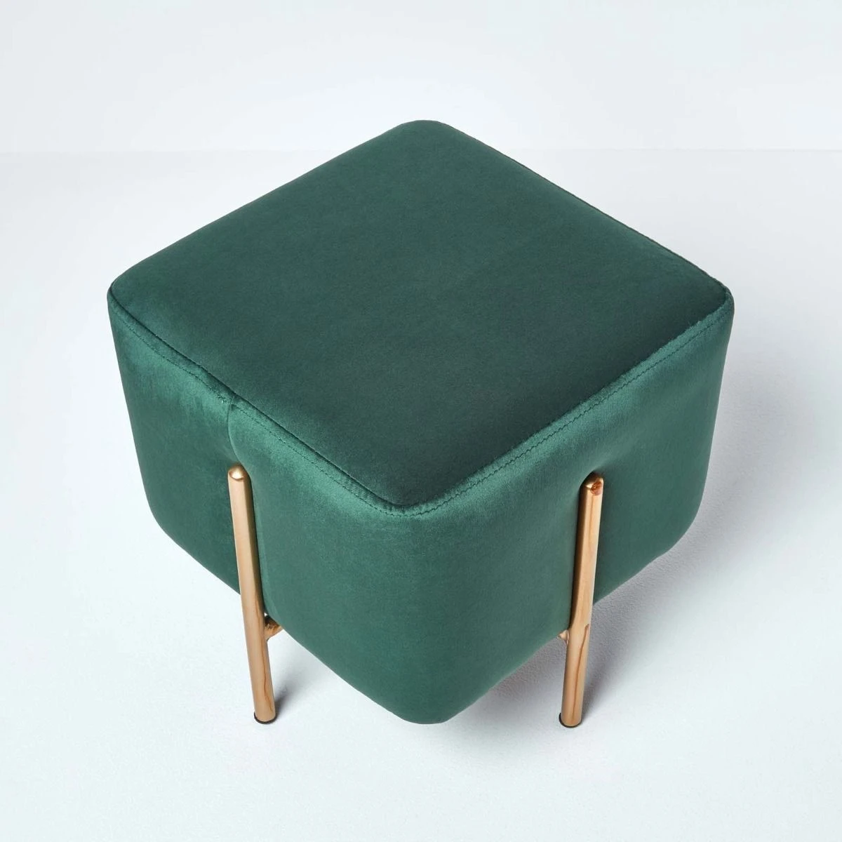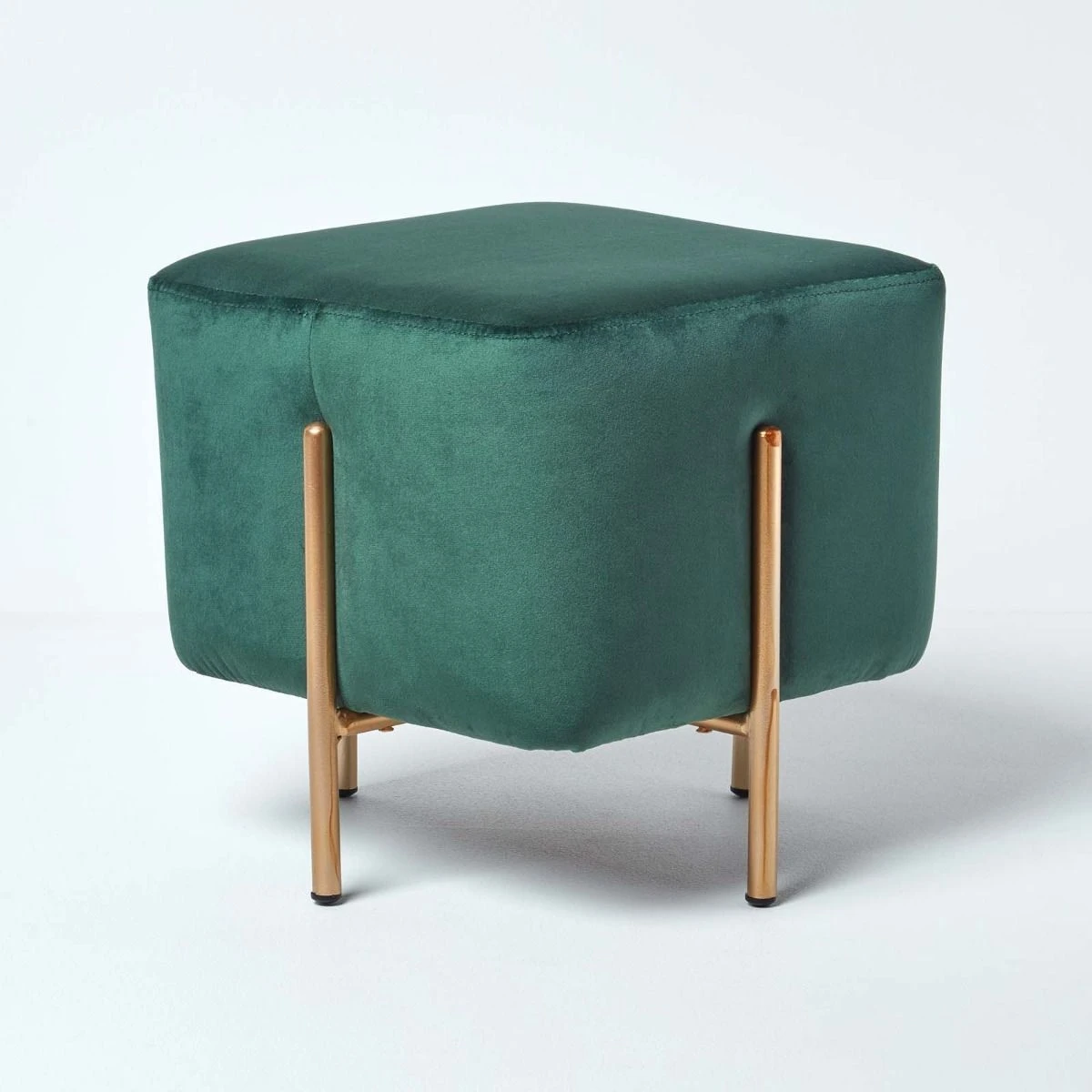 Add a burst of colour and sleek style to your interiors with the emerald green Osborne velvet footstool, a versatile footstool ideal to use in your living room or bedroom, this sturdy cube footstool rests on a golden metal frame and is supported by an internal wooden frame structure.