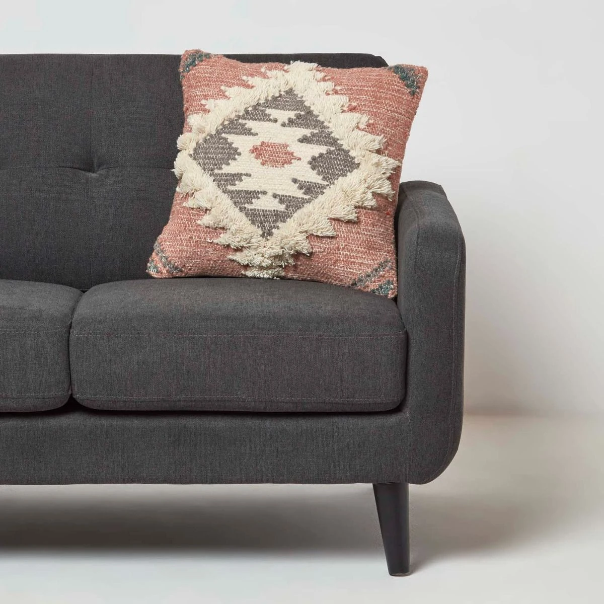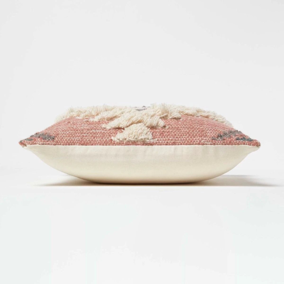 Handcrafted kilim cushion, this pale pink, cream and grey cushion is handwoven on traditional handlooms and will add a splash of style to your home. Measuring 45 x 45 cm, this decorative scatter cushion features a tufted diamond design and is generously filled with a hypoallergenic super microfibre cushion insert that will remain plump over time