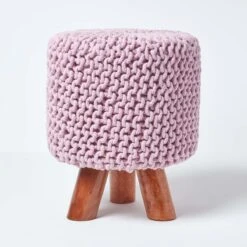 Pastel pink footstool from Homescapes, this pink knitted footstool is made from 100% cotton, measures 42 cm tall and features three wooden support legs.