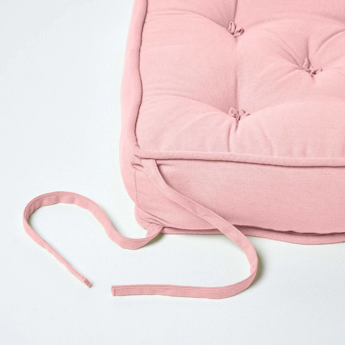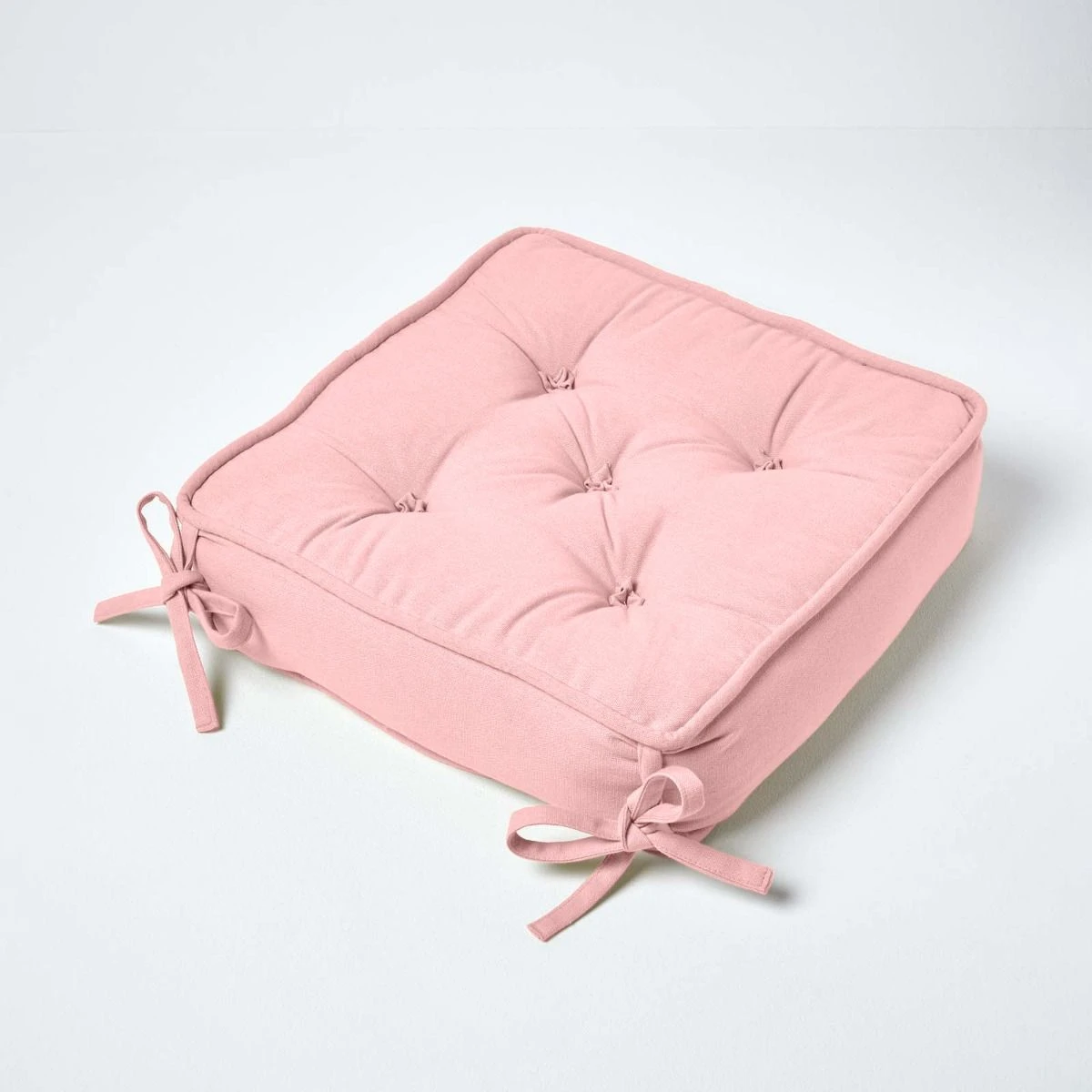 Homescapes dusty shade of pink dining booster cushion, a soft and natural colour to add to any dining room. This durable dining booster cushion, designed using five buttons to create a soft quilted effect for ultimate comfort and two useful string ties to help secure your dining booster in place.