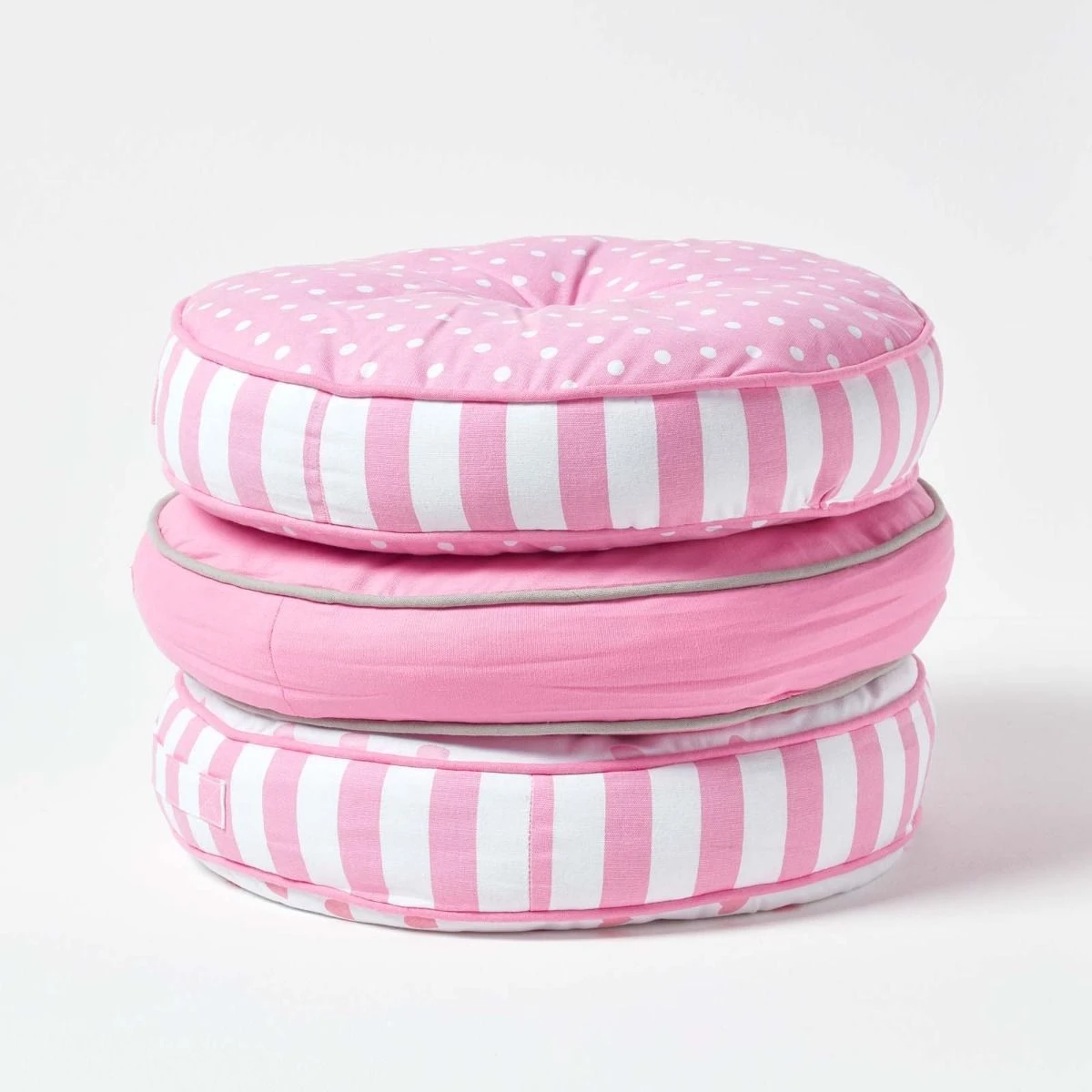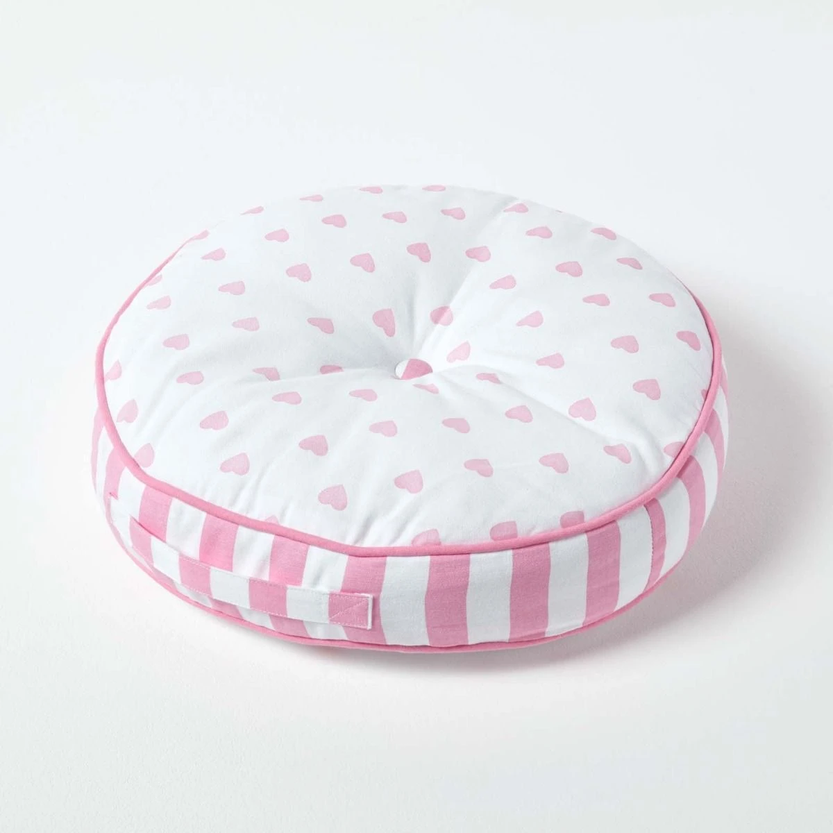 Round pink and white hearts and stripes floor cushion, indoor and outdoor filled floor cushion, 100% cotton circular cushion with soft super microfibre filling.