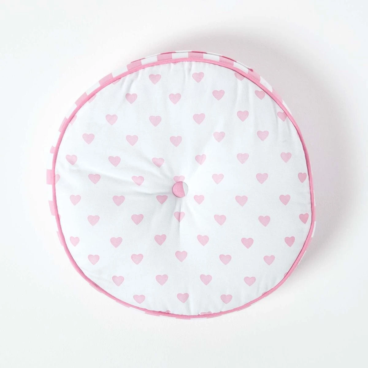 Pink and white round cushion suitable for indoor or outdoor use. Circular cushion filled with super microfiber and covered in a 100% cotton pink heart decorated case. This versatile cushion can be used in doors in children’s bedrooms or playrooms or outside on garden furniture.