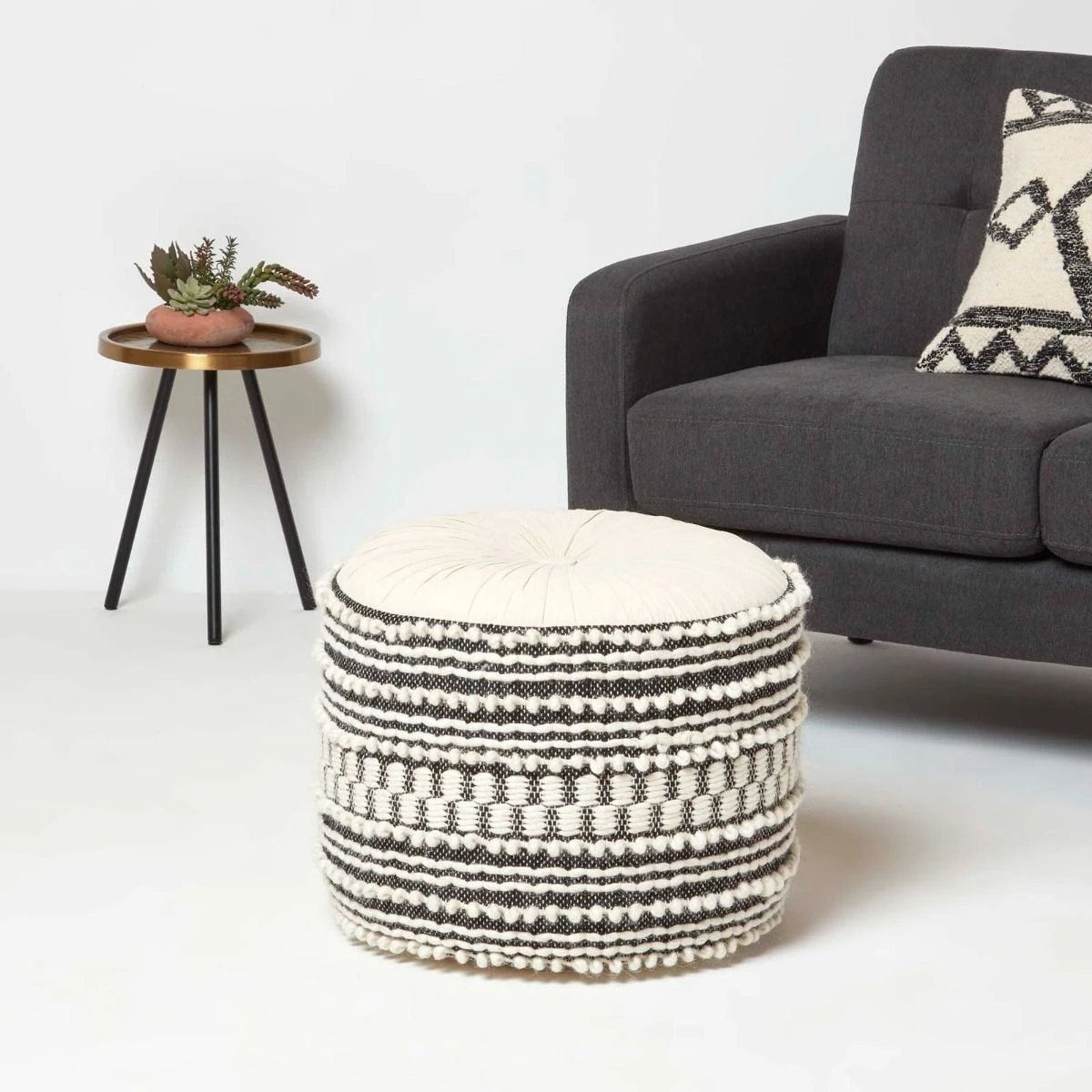 Priya Boho Footstool by Homescapes. A multi-functional addition to the home, this boho pouffe measures 50 x 40 cm and comes in black and white.