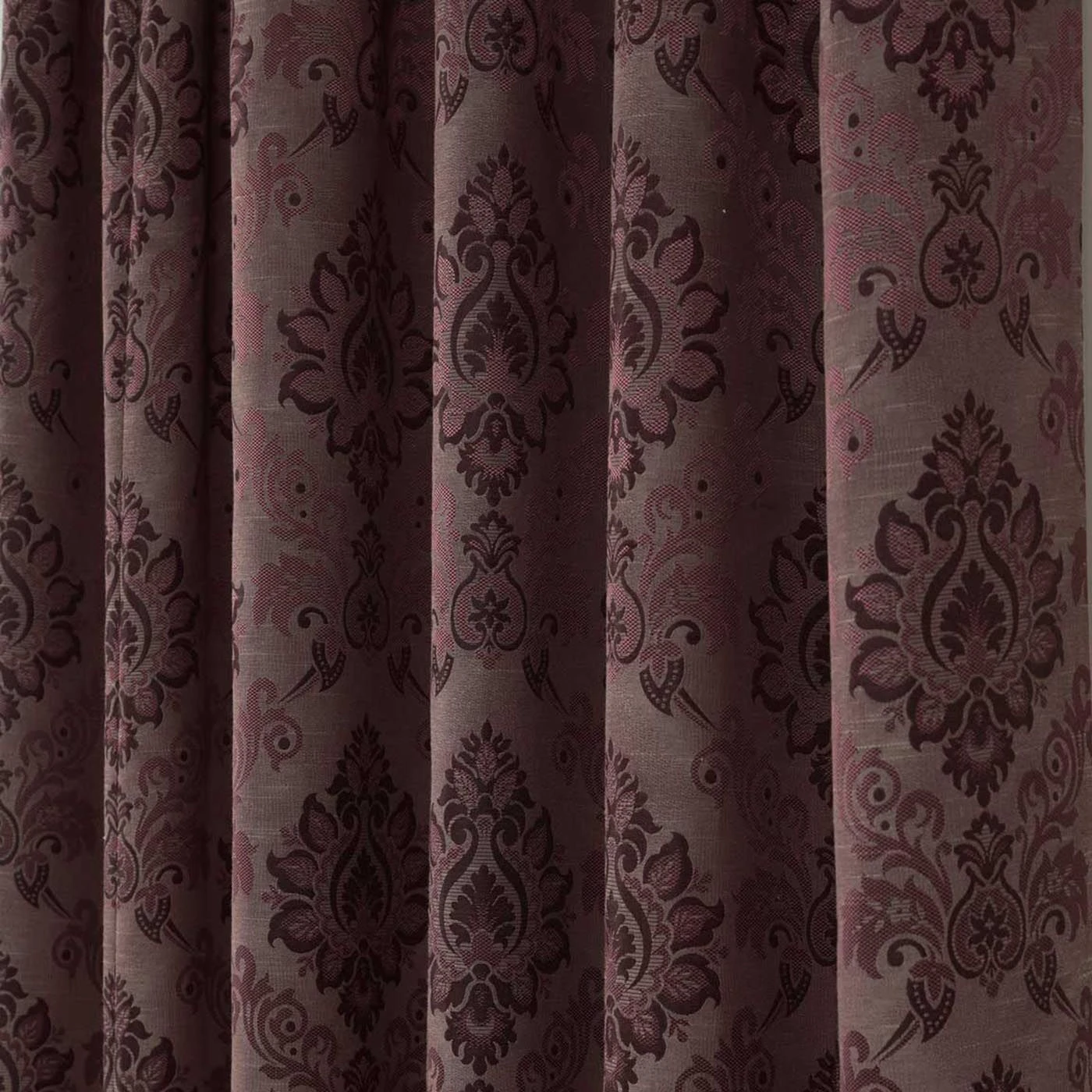 Featuring an ornate, floral damask-style motif, these intricately woven purple curtains are pencil pleated and fully lined for a classic look and a full drape.