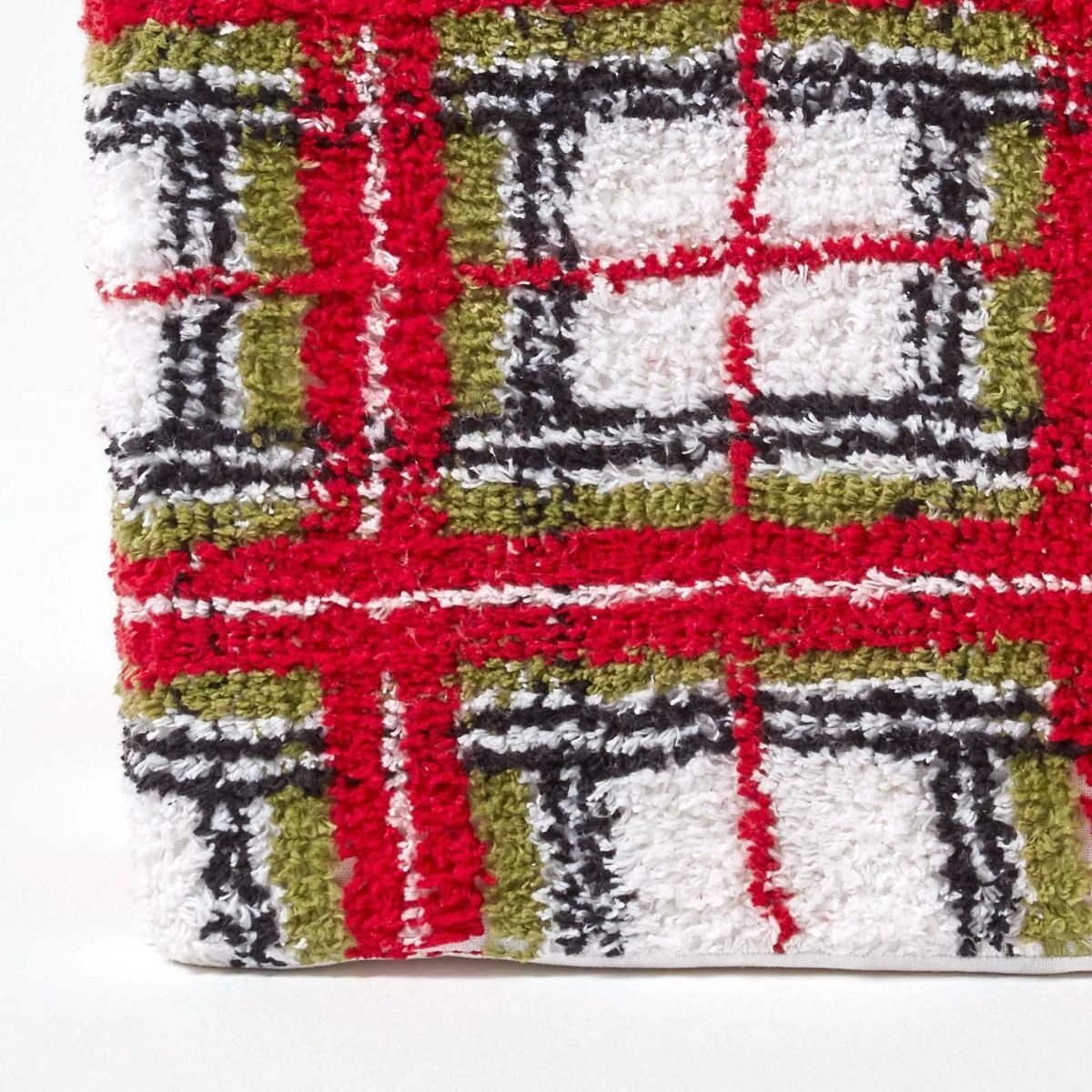 Homescapes cube pouffe, footstool, coffee or side table, upholstered in tufted cotton with the traditional red and white Scottish Tartan pattern.