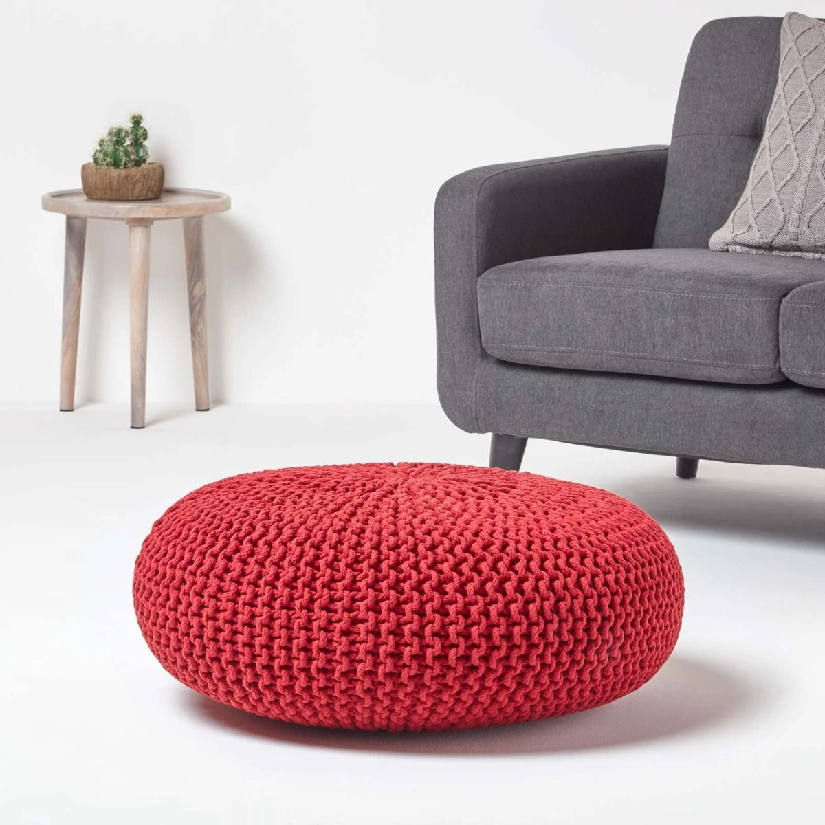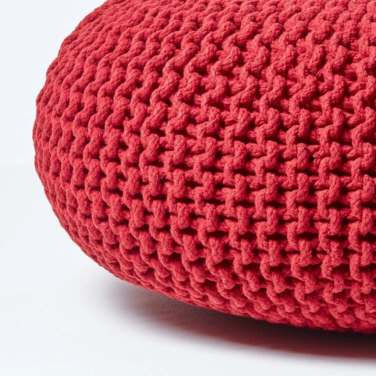 Large Red knitted pouf from our well designed large collection of round pouffes. This chunky fashionable range of pouffes is hand knitted with polystyrene beads filling. These are reasonably priced and are available in two classic shapes and 5 vibrant contemporary colours. Without doubt, these multipurpose large pouffes prove to be an indispensable home accessory. You can use them as decorative occasional seats, stylish foot stools or comfortable floor cushions in your living room, bedroom or nursery. Or why not treat your beloved cat or dog with a new place to cuddle up? These large floor cushions and pouffes will certainly withstand their claws thanks to the robust materials used.