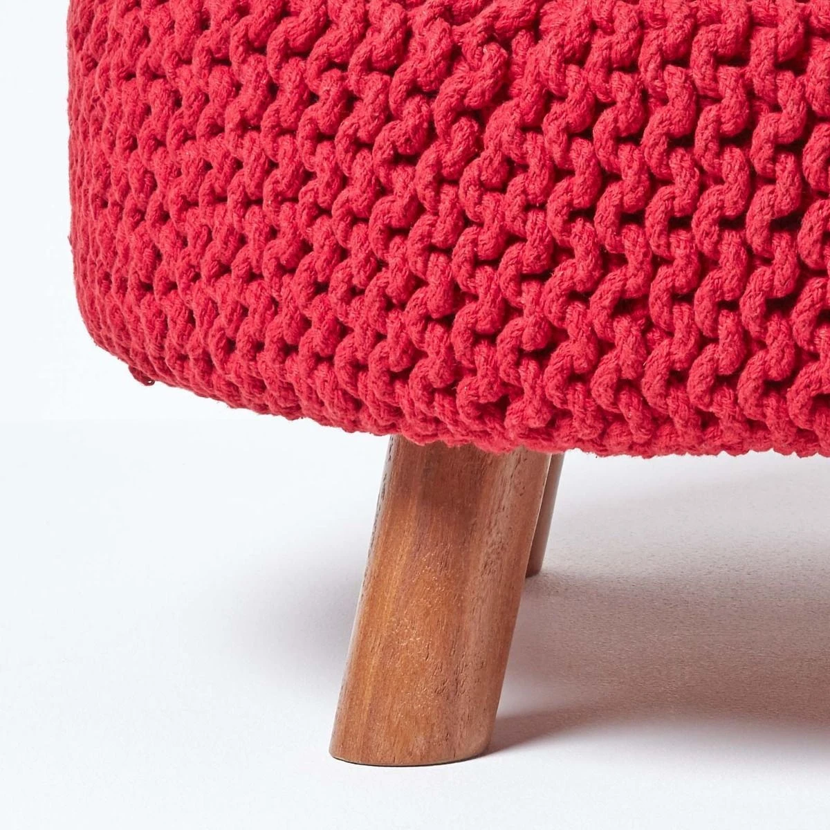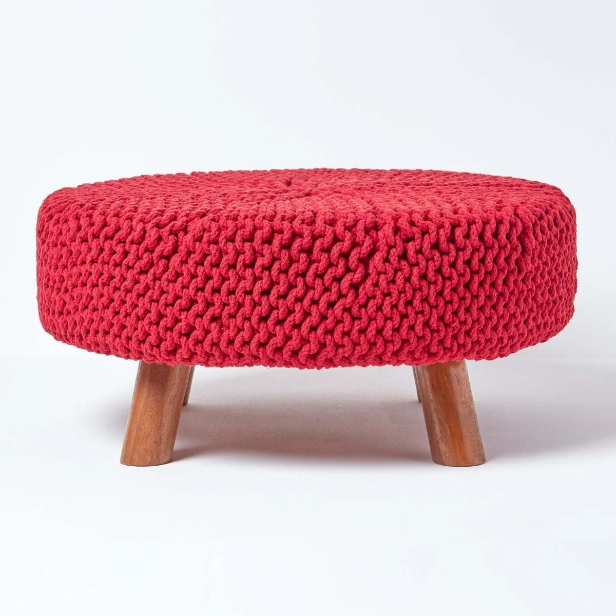 Red cotton flat footstool with four wooden leg, Homescapes knitted footstools are available in several colours and circular shapes to suit your living space.