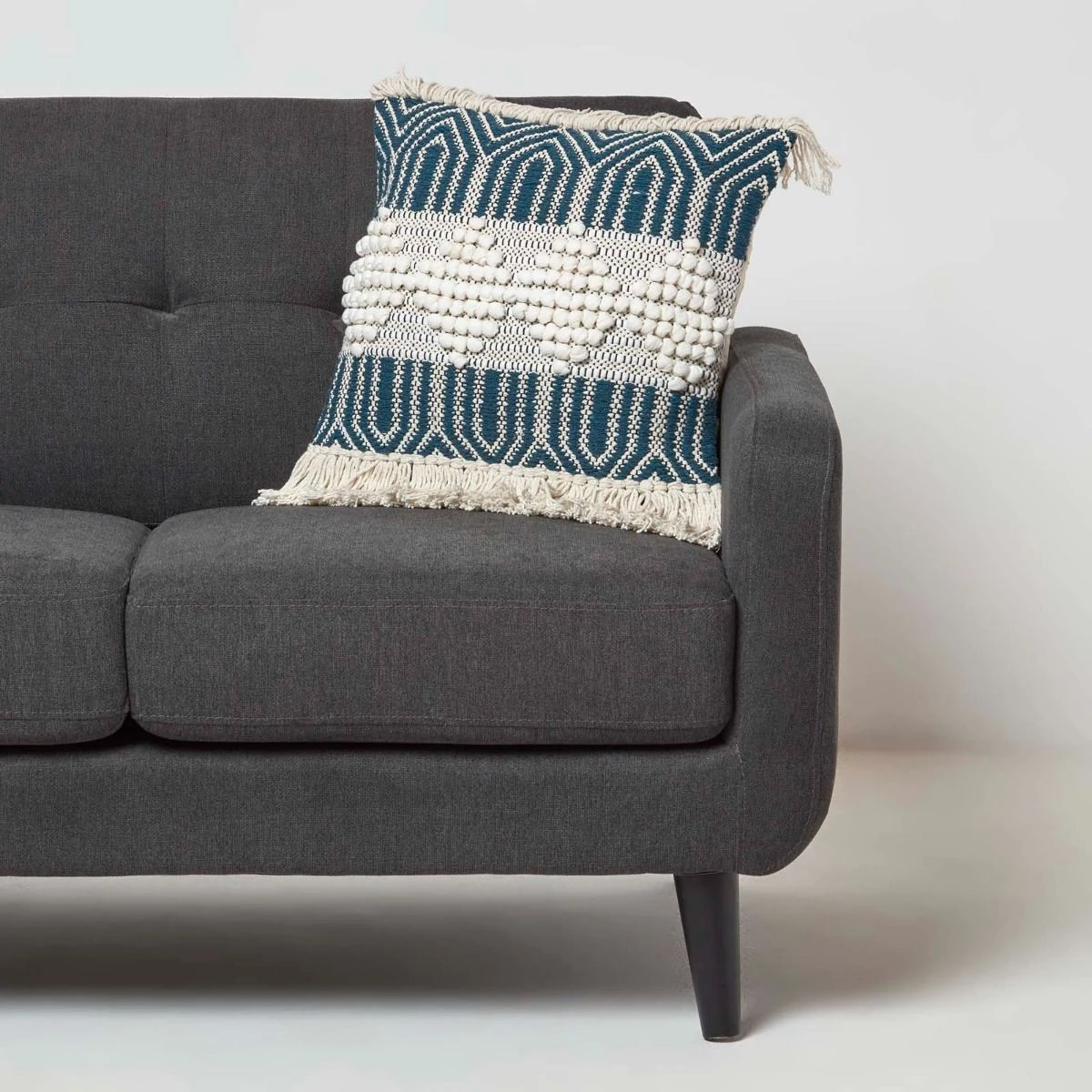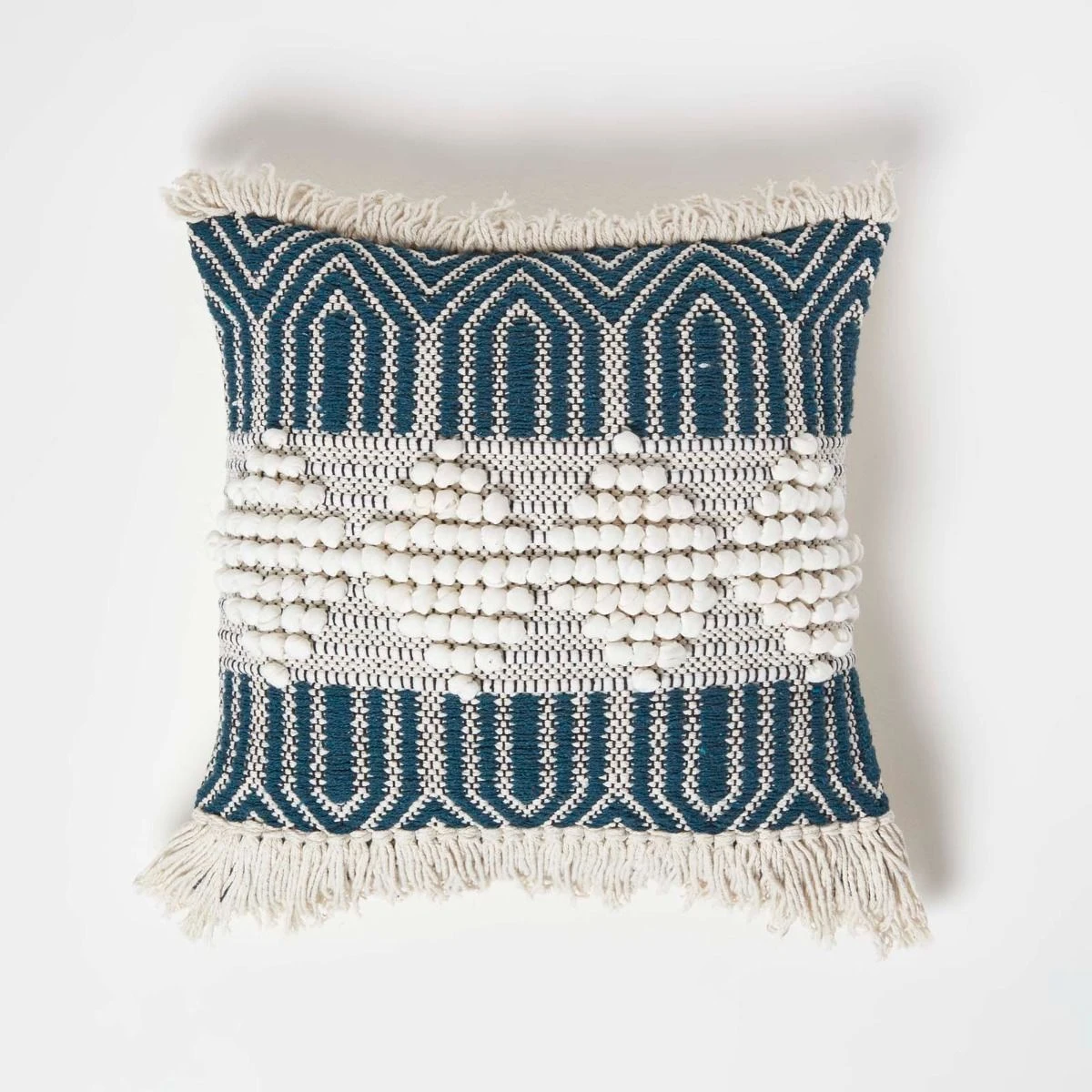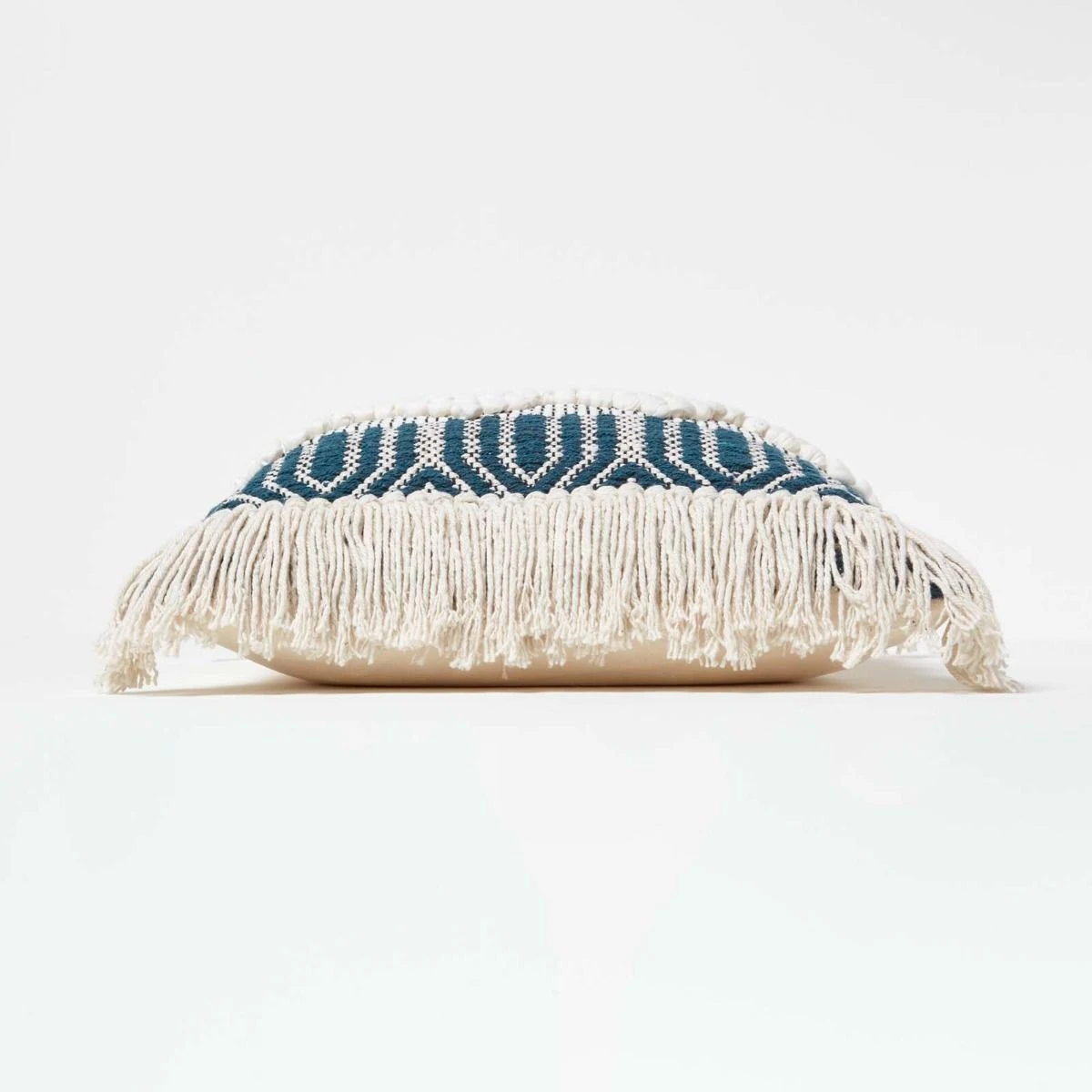 Handcrafted kilim cushion, this cream and blue cushion is handwoven on traditional handlooms and will add a splash of style to your home. Measuring 45 x 45 cm, this geometric scatter cushion features a braided style woven geometric design and a decorative fringe edging. Generously filled with a hypoallergenic super microfibre cushion insert, it will remain plump over time