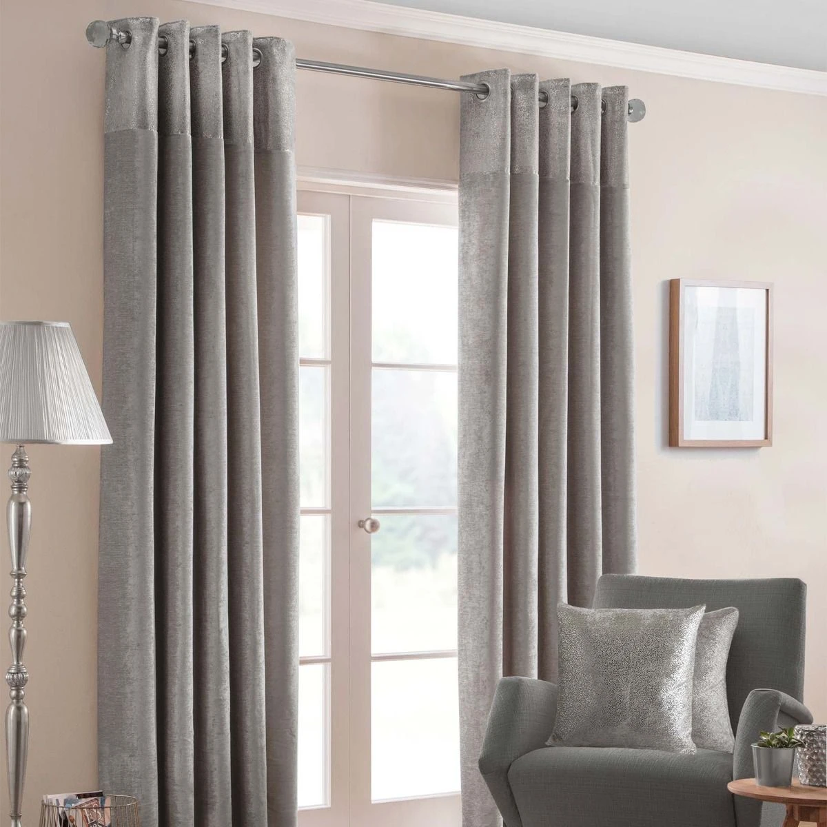 Contemporary silver curtain pair in a luxurious chenille style fabric with a shimmery foil banded top for added style to glamourous interiors with an easy to hang eyelet header.