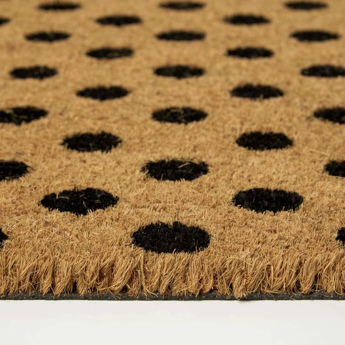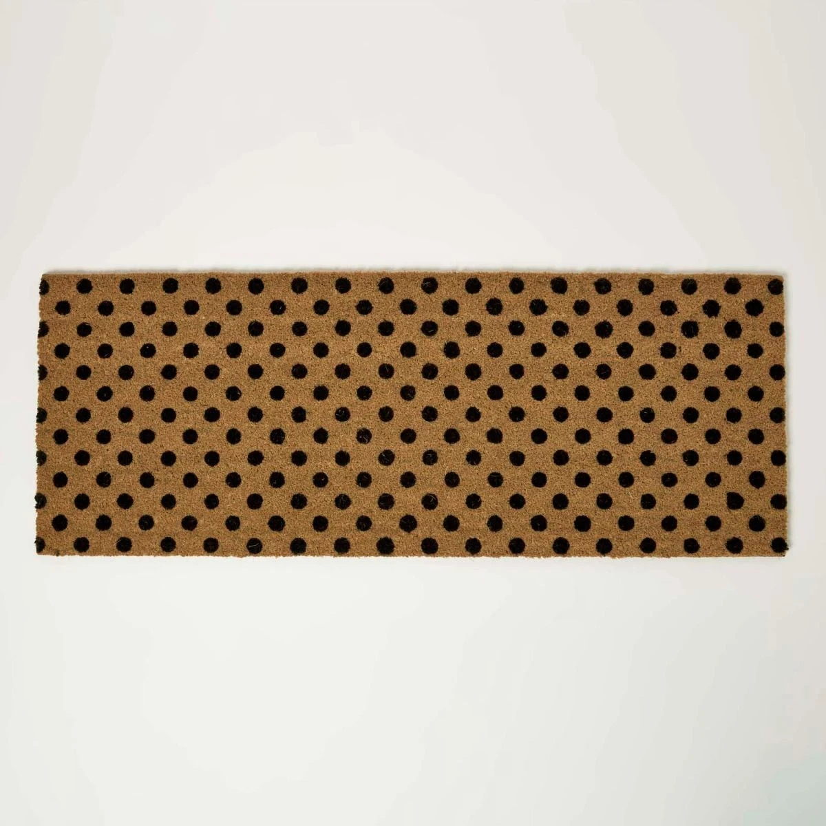 Extra-large double door mat, long and durable coir doormat black polka dot design, a strong non-slip rubber back runner style mat for indoor and outdoor use.