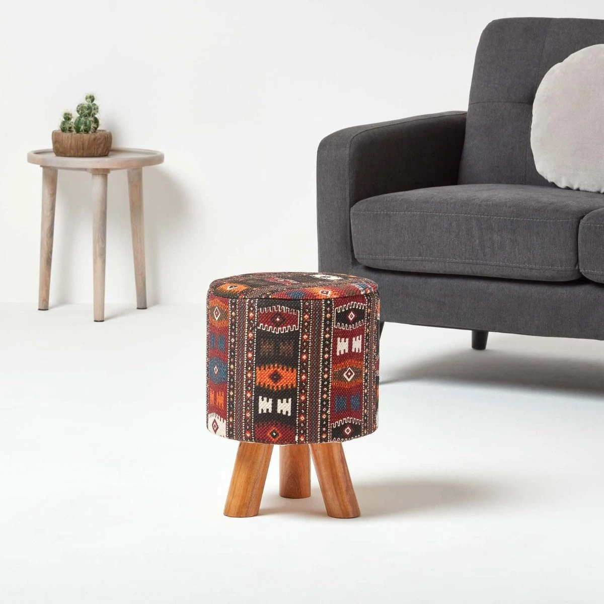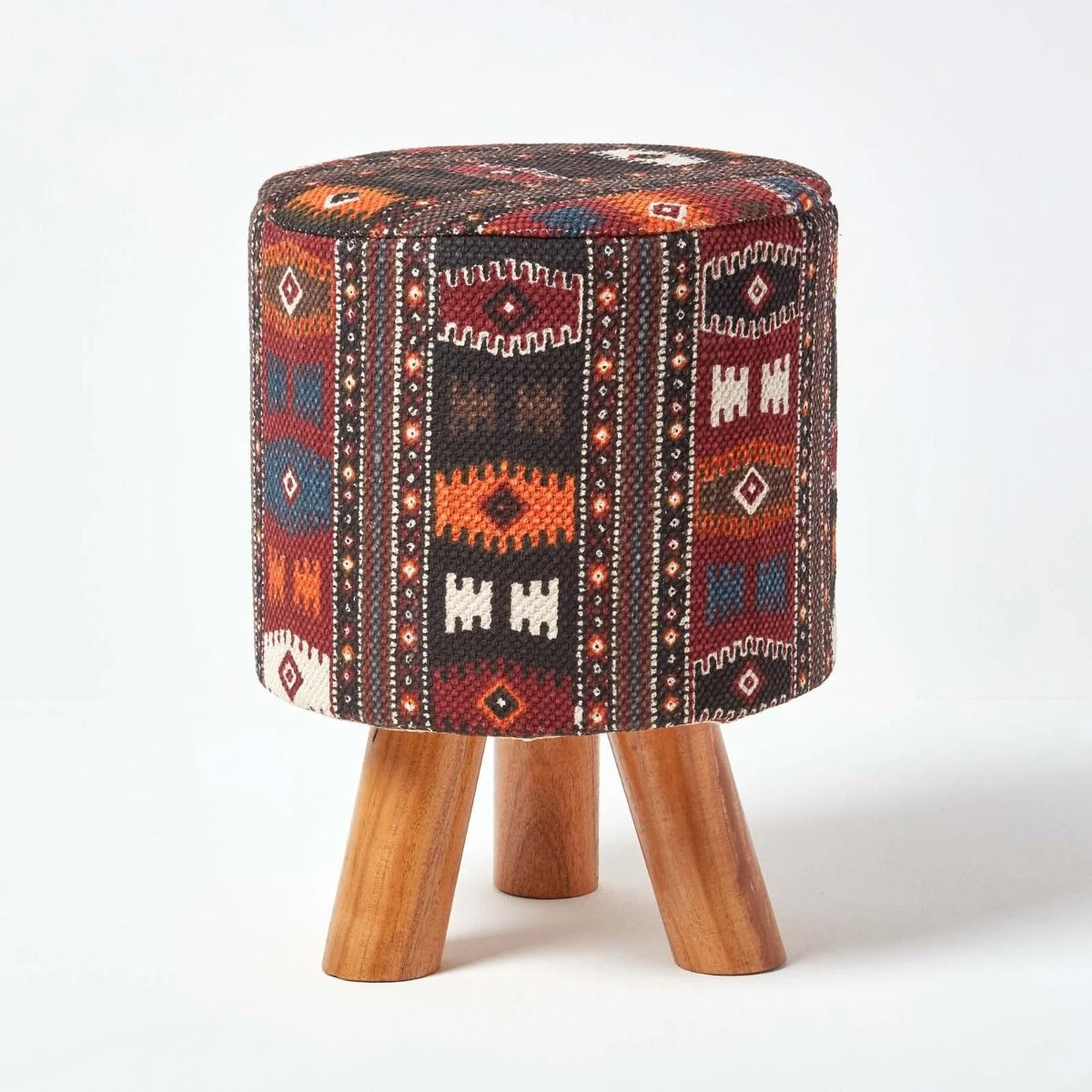Homescapes tall Middle-Eastern style kilim footstool featuring three wooden support legs, made from 100% cotton and featuring rich brown, red and yellow tones