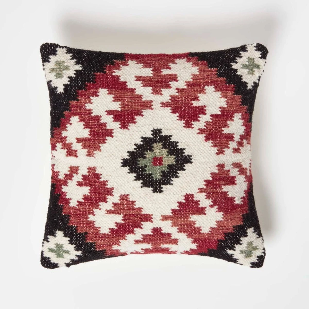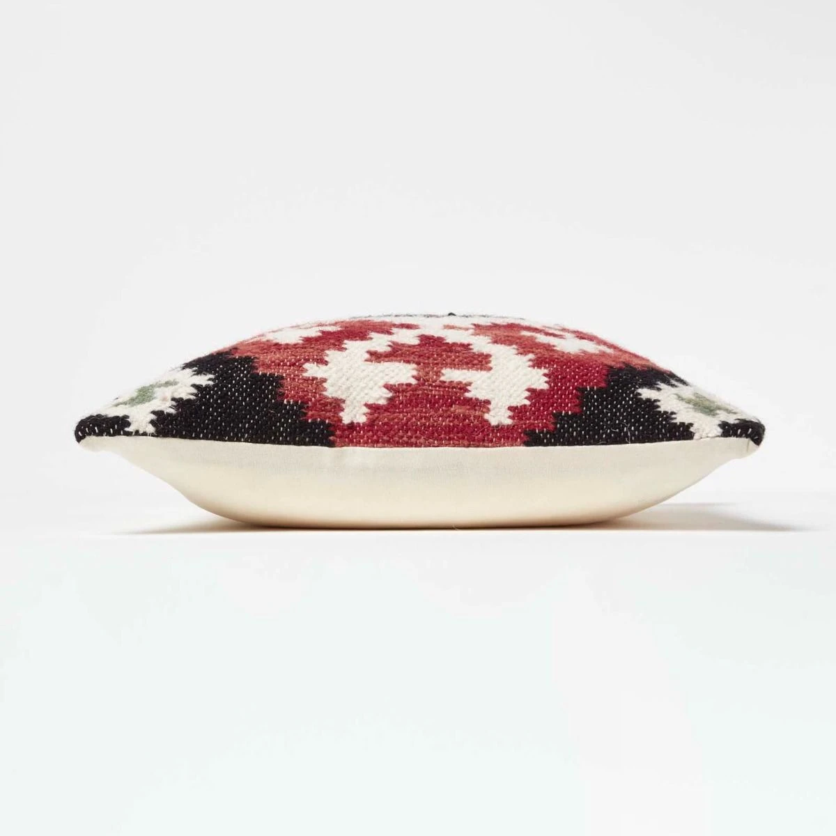 Red and black traditional style handwoven kilim cushion, a colourful textured cushion handcrafted from pure wool and cotton and featuring a geometric style design.