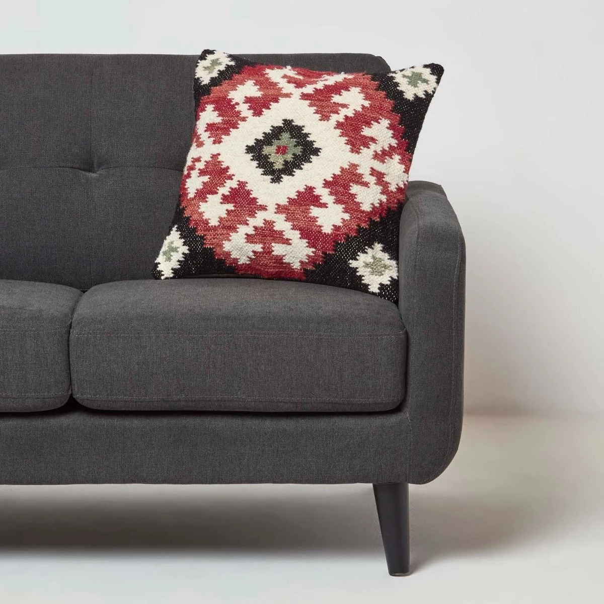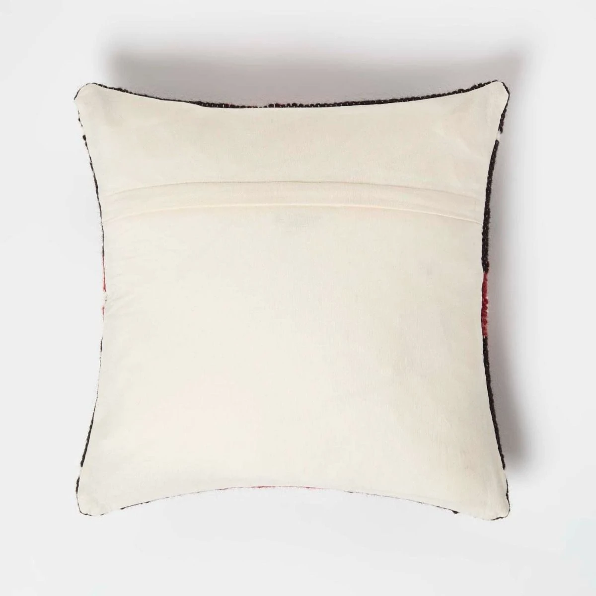 Expertly handcrafted black and red traditional kilim cushion with tufted design. Handwoven on traditional handlooms, this textured traditional design will add a touch of colour to your home. Measuring 45 x 45 cm, this decorative scatter cushion is generously filled with a hypoallergenic super microfibre cushion insert that will remain plump over time