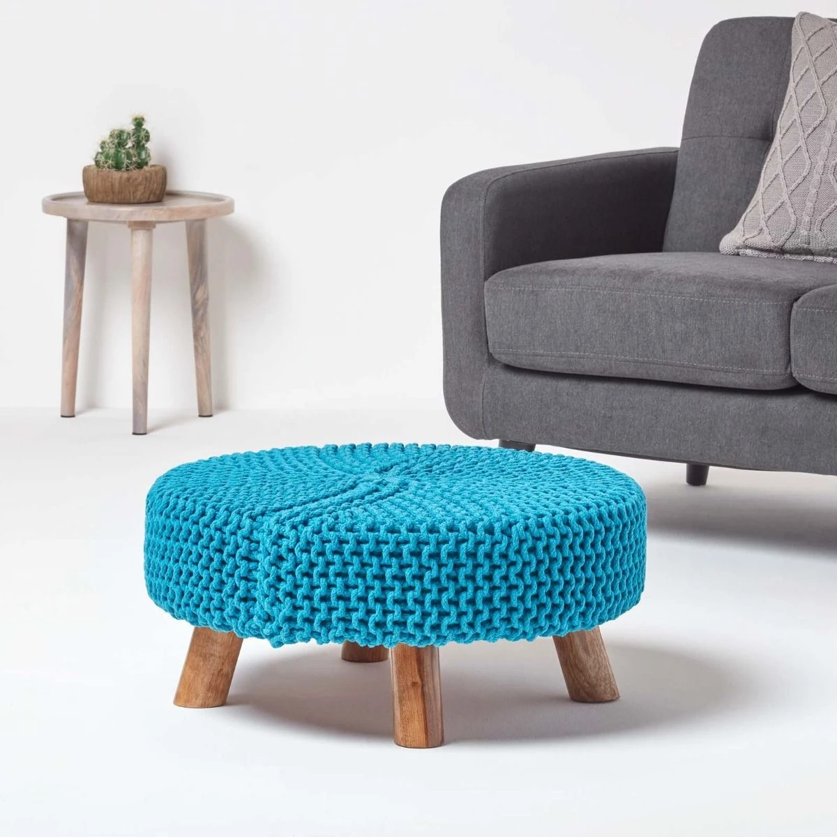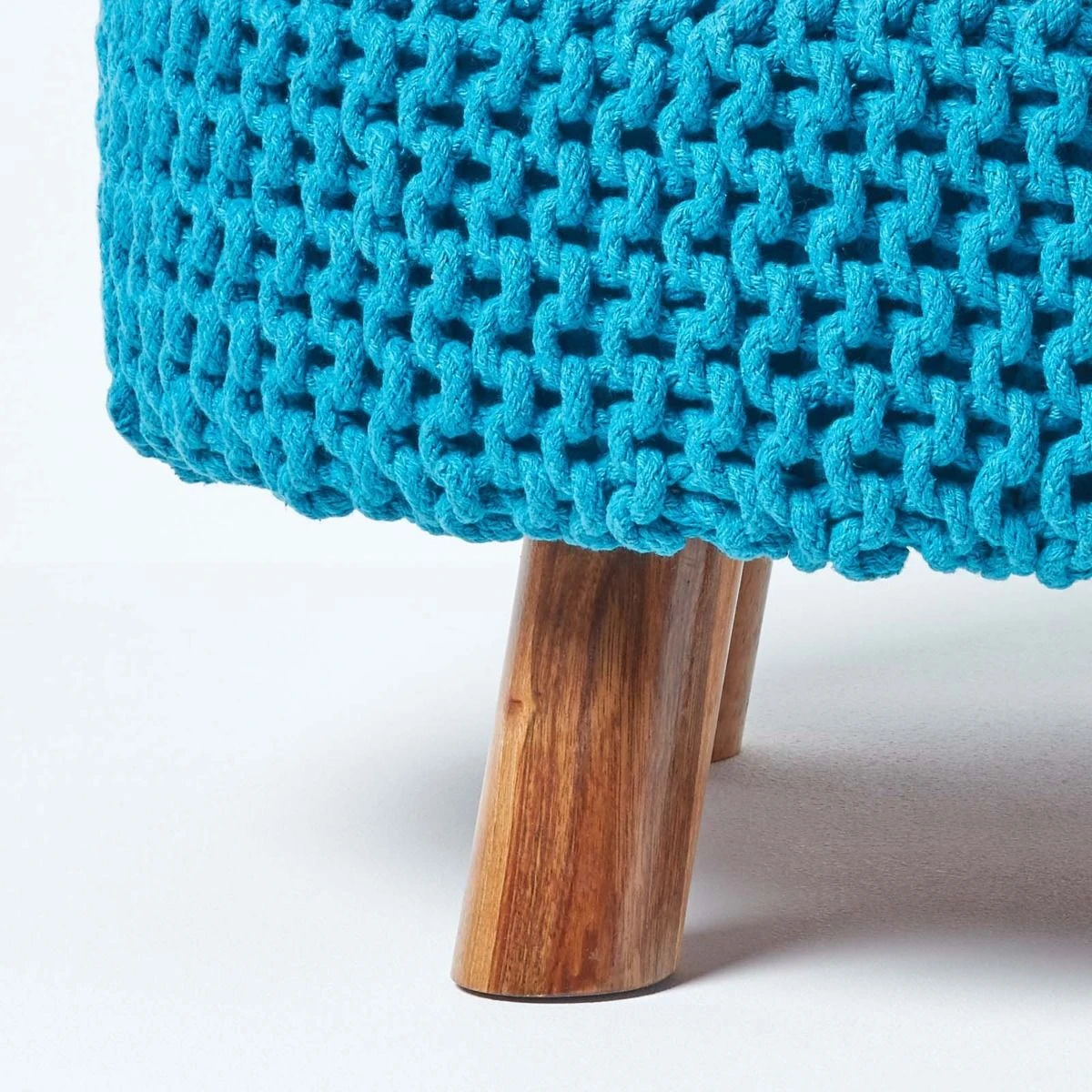 Update your living room with Homescapes’ teal blue handcrafted knitted footstool. A multifunctional home accessory that will complement both contemporary and traditional style interiors. It features three wooden legs for support and measures 30 cm in height and 62 x 62 cm wide. Ideal to use as a footrest, occasional seat or even as a small coffee table.
