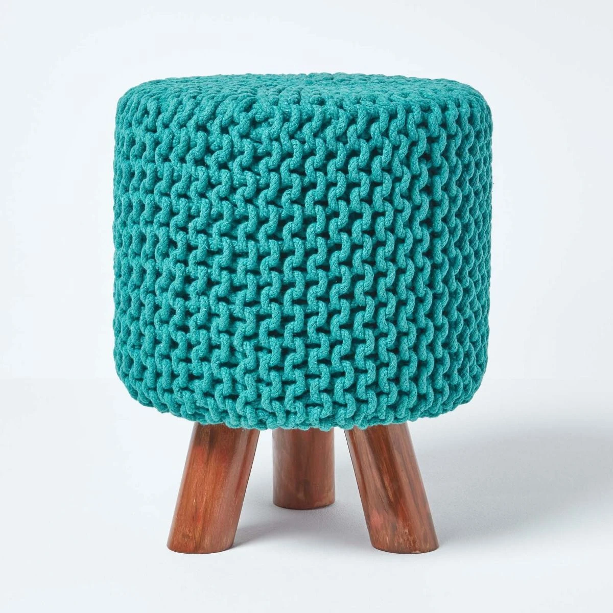 Vibrant and colourful teal green knitted footstool with wooden legs, handwoven chunky knitted design 32cm tall pouffe for relaxing or use as occasional seat.