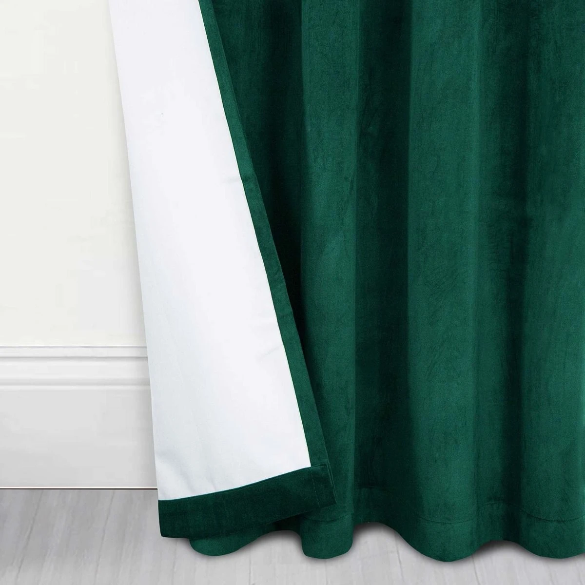 Super soft and thick emerald green blackout velvet curtains with 100% blackout lining. Crafted from exclusive 3-pass coating technology, these genuine blackout curtains block out sunlight and artificial lighting, keeping your room pitch black, ensuring complete privacy and allowing you to get the perfect night’s rest. Comprising of a soft and textured velvet fabric, blackout coating and a flocking layer this patented technology is unlike any other and will provide genuine blackout throughout the year. A versatile curtain that can be used in living rooms and bedrooms, these velvet curtains also possess outstanding thermal qualities, protecting against heat loss and heat gain and reducing energy costs during colder months.