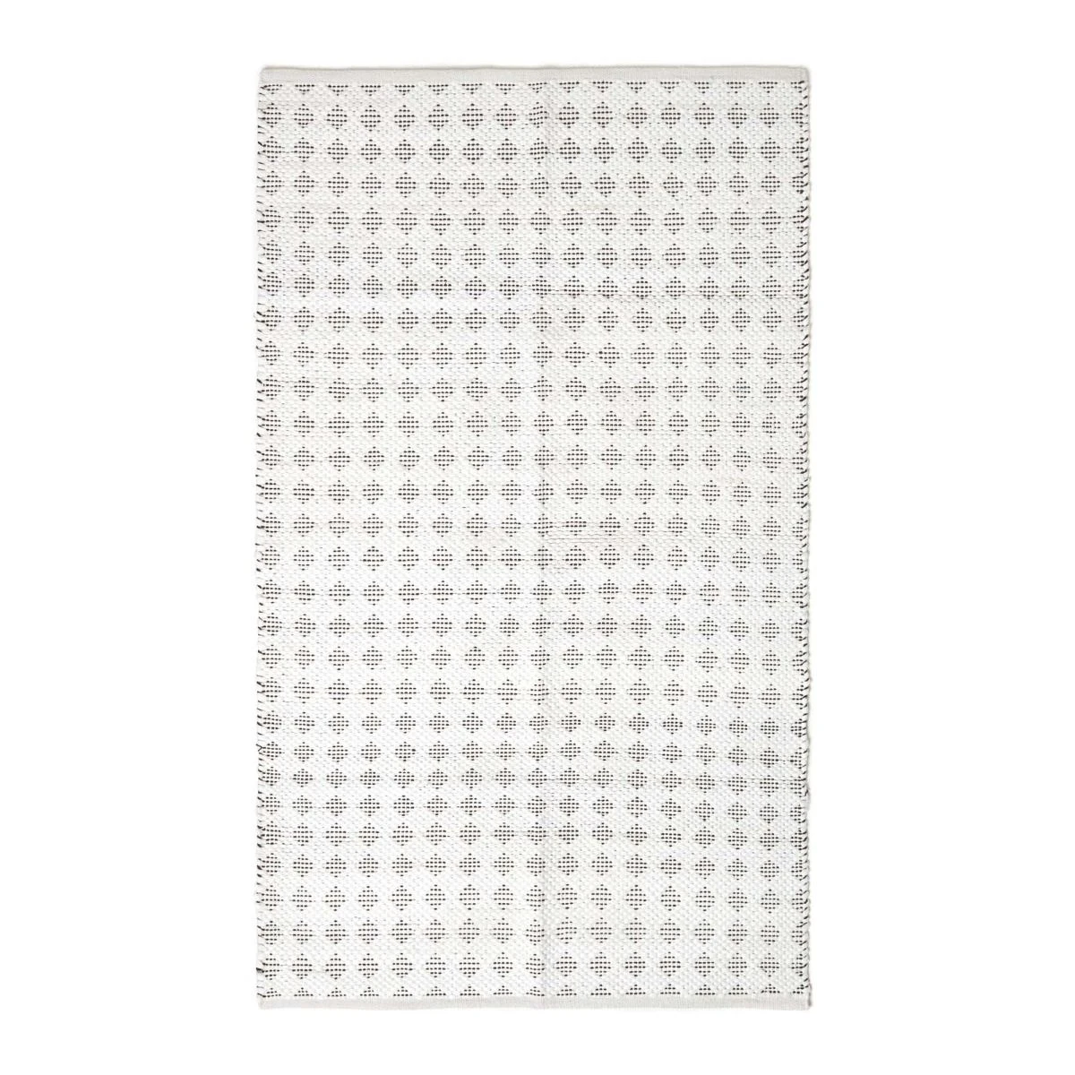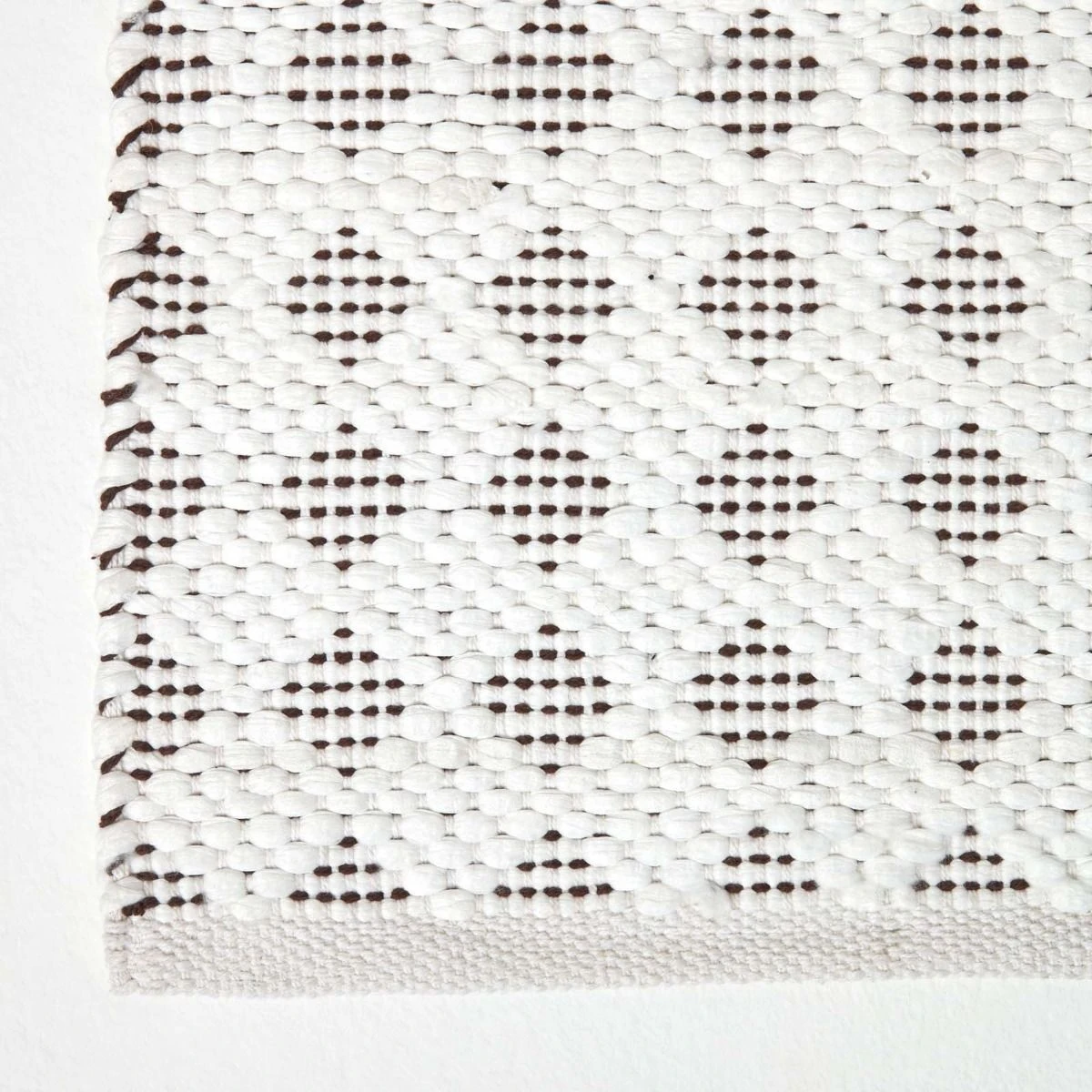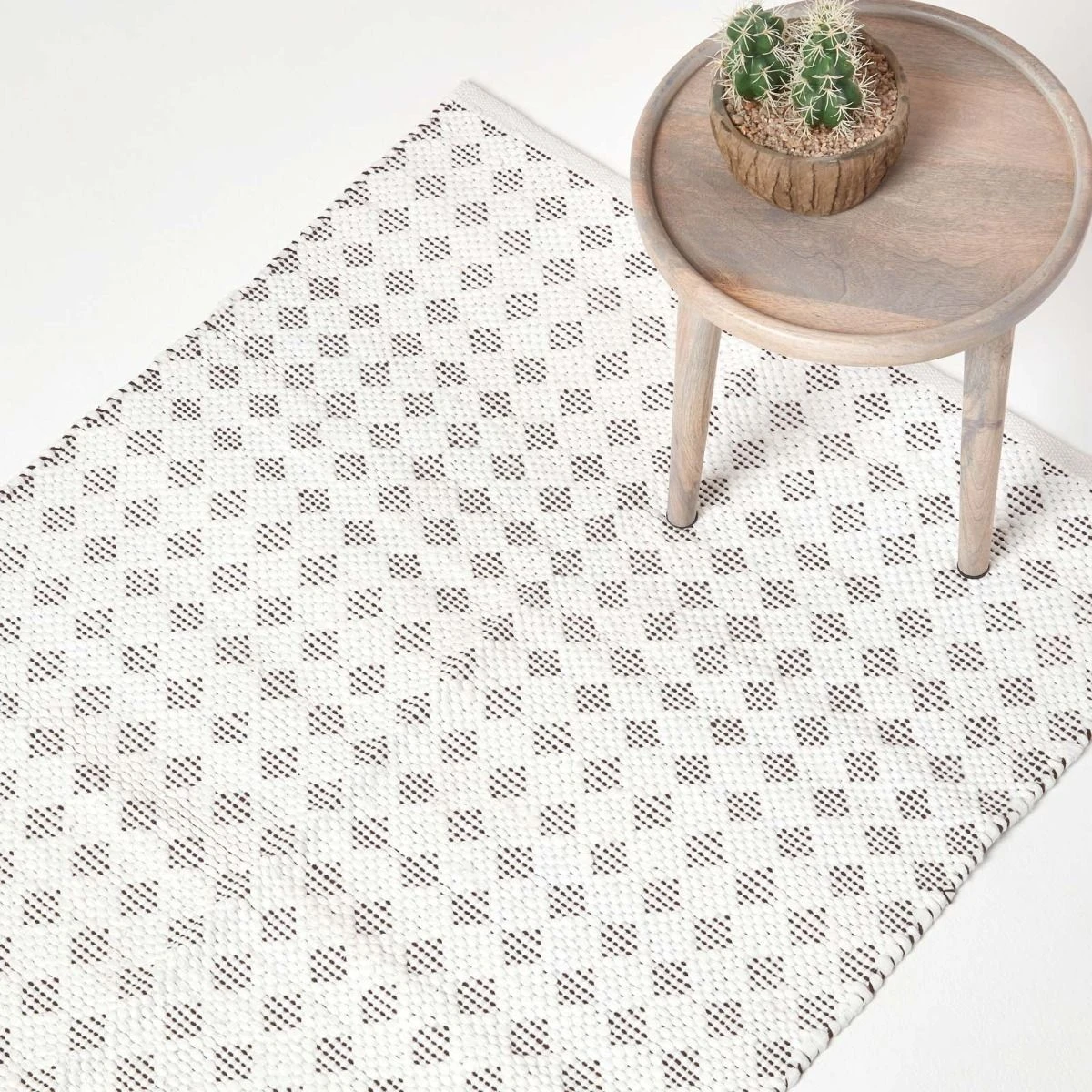 Sporting a diamond checked pattern in black and white, this greyscale rug is both attractive and fit for purpose. Available in two colours and five sizes you can be sure that there will be a suitable version of this mat to match the style and space provided by your home.Manufactured using cotton, this floor covering exhibits attributes such as flexibility, versatility and stain resistance. These traits allow the piece to function well in most environments, particularly in rooms where you might experience spillages or where children are often present with sticky fingers! This is due to the nature of the material being very easy to clean and maintain.Why not match this product up with other parts of Homescapes interior decor ranges, such as the ultrasonic cushions.