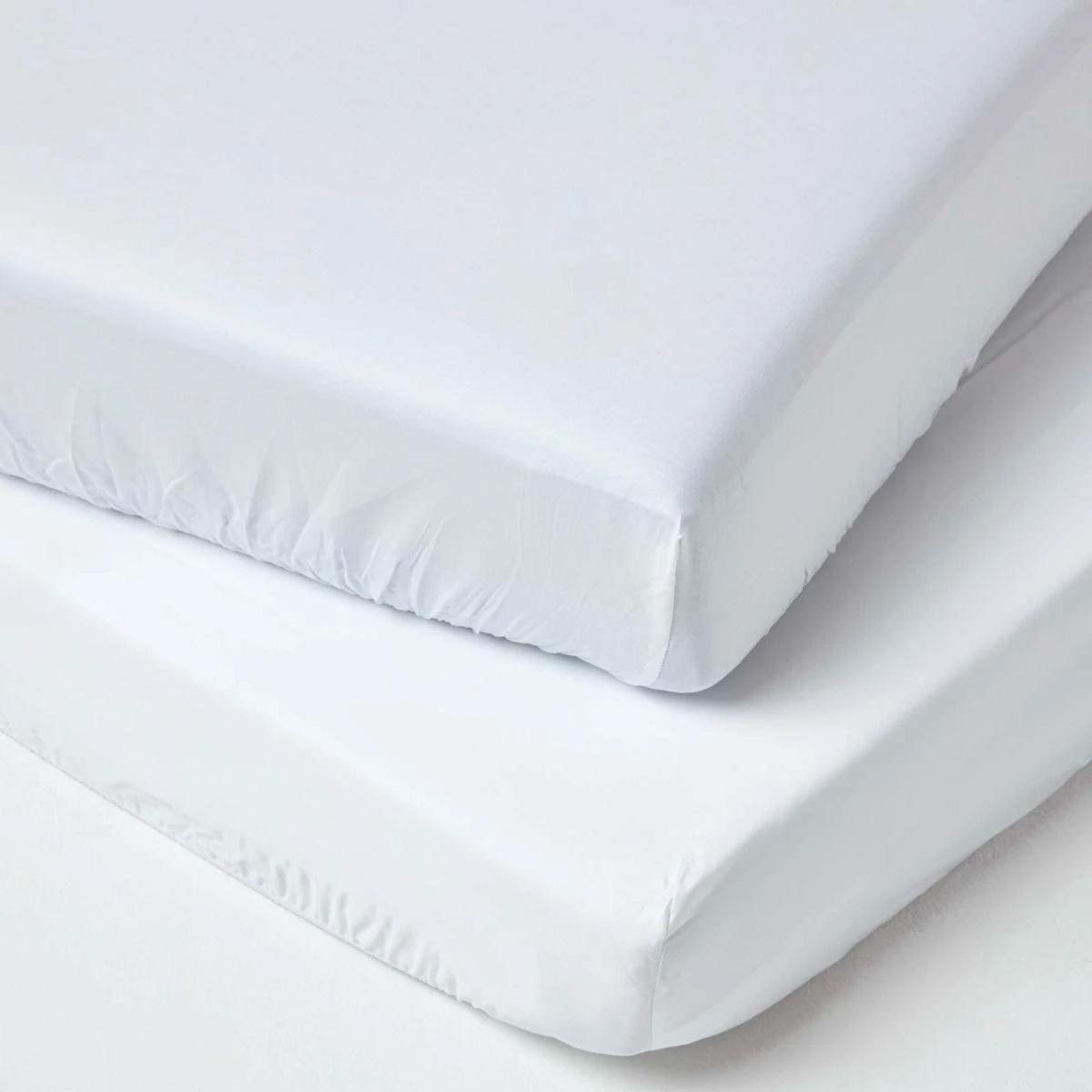 Set of 2 white 100% organic cotton baby cot sheets. Washable, hypoallergenic and perfect for baby soft skin, this two-pack of cot mattress sheets are durable and super soft.