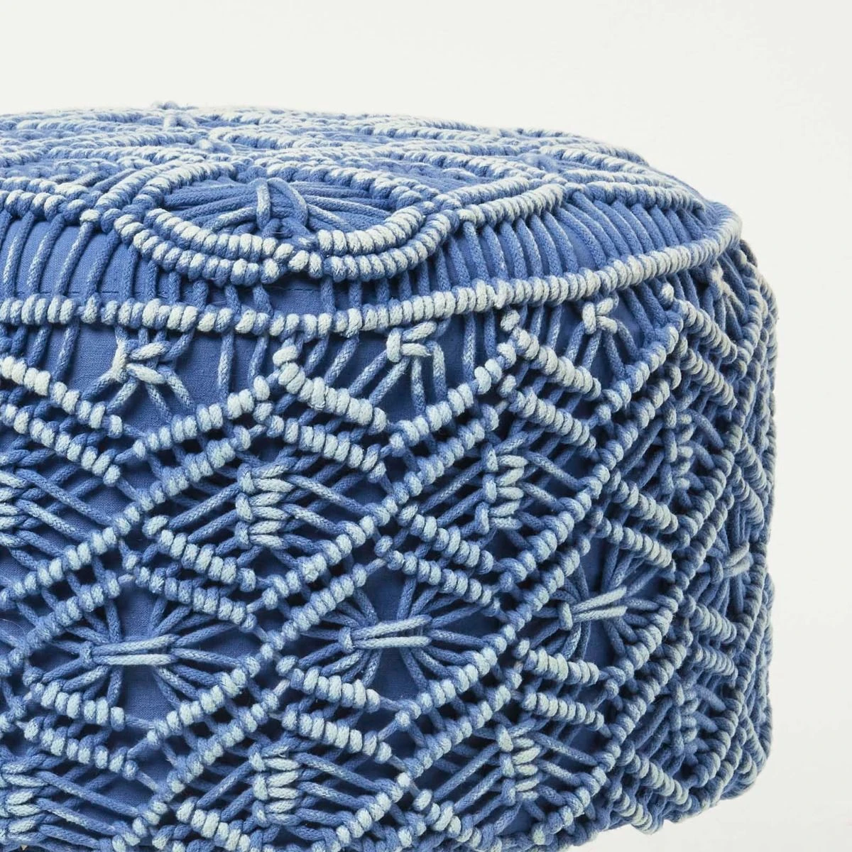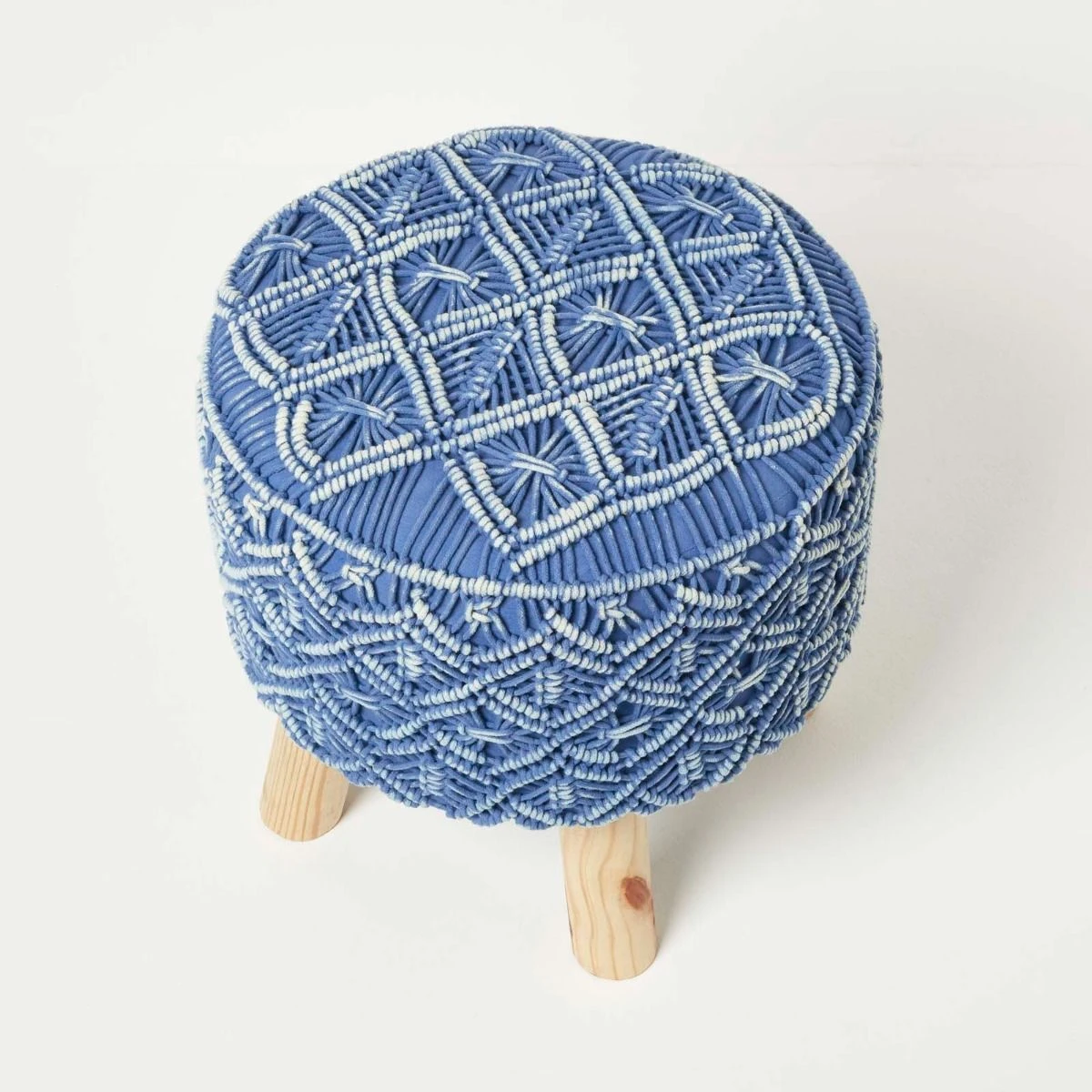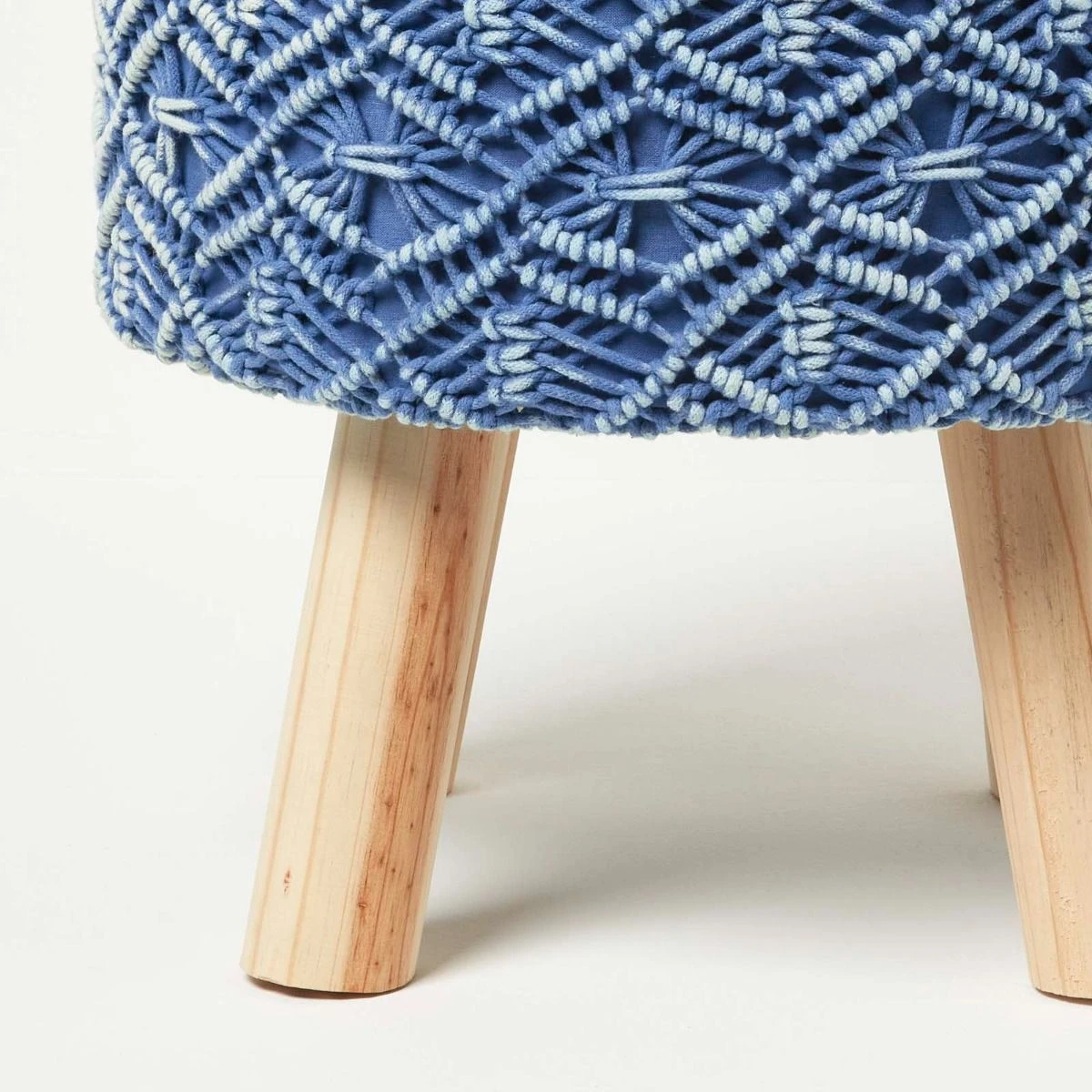 Distressed style macrame pouffe, a colourful home accessory, this crochet footstool has a woven 100% cotton cover dyed blue and sits on solid wooden legs.