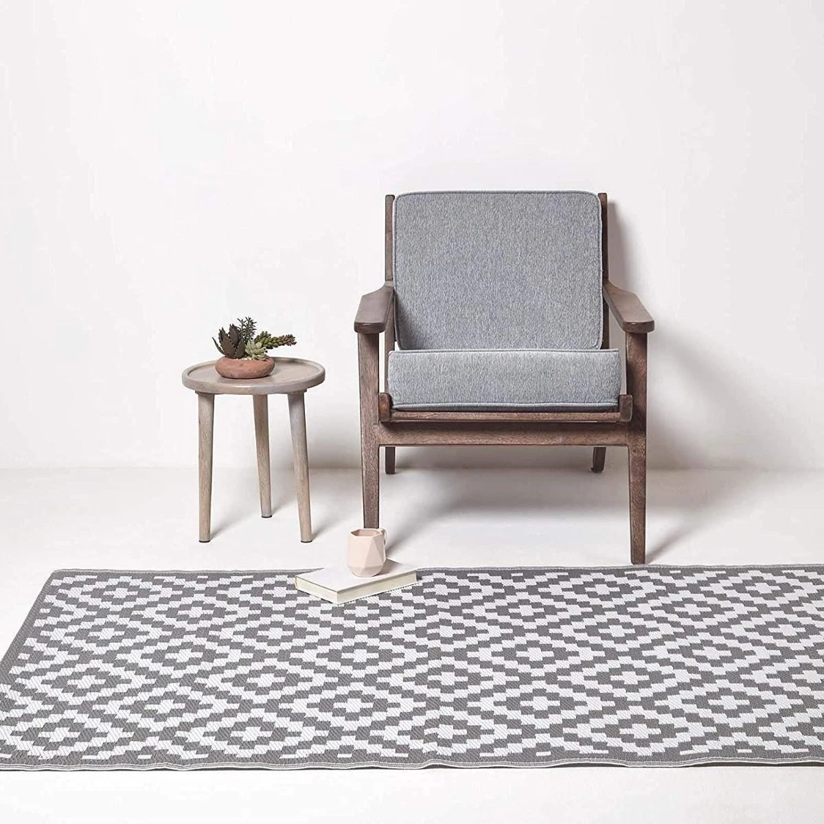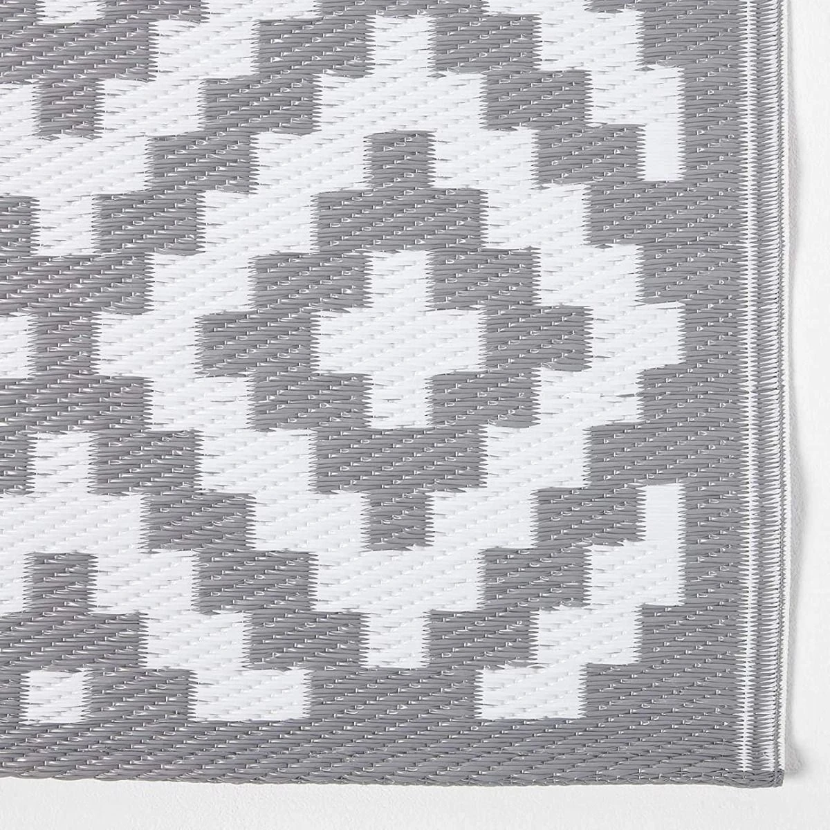 White and grey outdoor rug from Homescapes, Geometric style garden rug with diamond pattern, woven from 100% recycled polypropylene, this rug is weather resistant.