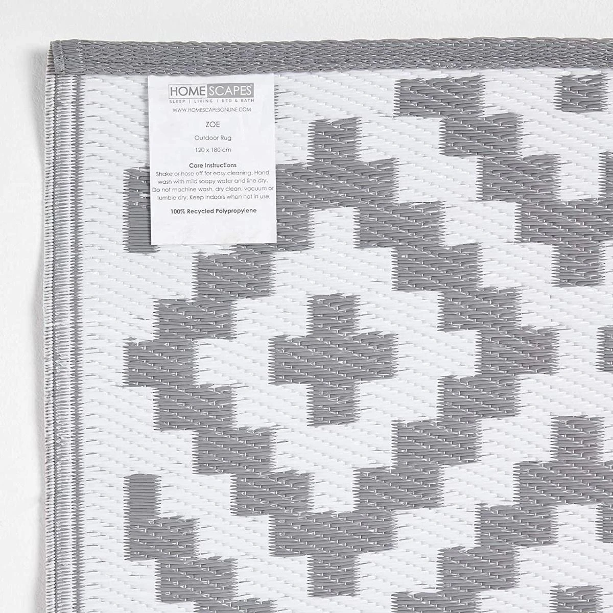 A stylish addition to your garden or patio area, the Zoe outdoor rug is woven entirely from 100% recycled polypropylene, a durable, lightweight garden rug, it is weather resistant and water-permeable. Featuring a white and grey geometric style design. It will add colour and style to any seating area and is ideal for use around patio furniture and garden bars.